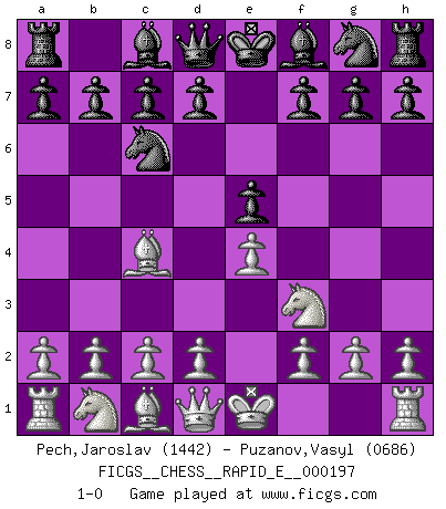 Last move : 1-0 2018 February 24 3:24:13 [Event "FICGS__CHESS__RAPID_E__000197"] [Site "FICGS"] [Date "2018.01.05"] [Round "1"] [White "Pech,Jaroslav"] [Black "Puzanov,Vasyl"] [Result "1-0"] [WhiteElo "1442"] [BlackElo "0686"] 1.e4 e5 2.Bc4 Nc6 3.Nf3 1-0 This chess game has been lost on time (started : 2018.01.05 4:5:34) Bishop's Opening Player White won this chess game. Follow this game move after move (download)The boy (then a 12 year old boy named Anatoly Karpov) doesn't have a clue about Chess, and there's no future at all for him in this profession. (Mikhail Botvinnik) Wenn ein Kopf und ein Buch zusammenstoßen und es klingt hohl, ist es denn allemal im Buche? (Georg Christoph Lichtenberg) La captura del Rey enemigo es la finalidad pero no el primer objetivo de la partida. (William Steinitz) Vous savez, camarade Pachman, je n'éprouve pas de plaisir à être ministre, je jouerais plutôt aux échecs comme vous, ou alors ferais une révolution au Venezuela. (Che Guevara à Ludek Pachman, 'Checkmate in Prague', 1975) All art requires courage. (Anne Tucker)