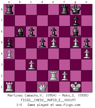 Last move : 1-0 2018 March 19 17:55:18 [Event "FICGS__CHESS__RAPID_E__000197"] [Site "FICGS"] [Date "2018.01.05"] [Round "1"] [White "Martinez Camacho,Victor Hugo"] [Black "Moko,Seth"] [Result "1-0"] [WhiteElo "0954"] [BlackElo "0935"] 1.e4 c6 2.d4 d5 3.Nd2 Nf6 4.Ngf3 dxe4 5.Ne5 Bf5 6.c3 Nd5 7.Be2 e6 8.O-O Qg5 9.Ndf3 Qf6 10.Bg5 Qxg5 11.Nxg5 f6 12.Ngf3 exf3 13.Bxf3 Bd6 14.Re1 fxe5 15.dxe5 Bc5 16.Bxd5 cxd5 17.g4 Bg6 18.h4 h5 19.g5 Nc6 20.b4 Bb6 21.a4 a5 22.b5 O-O 23.bxc6 bxc6 24.Re2 1-0 This chess game has been lost on time (started : 2018.01.05 4:5:34) Caro-Kann : 3.Nd2 Kingside Castling by player White (move 8) Kingside Castling by player Black (move 22) Player White won this chess game. Follow this game move after move (download)Chess is a fairy tale of 1001 blunders. (Savielly Tartakower) Schach ist Leben. (Robert James Fischer) El Ajedrez no es como la vida... ¡tiene reglas!. (Mark Pasternak) Les erreurs sont comme les malheurs, elles n'arrivent jamais seules. (Siegbert Tarrasch) I have opinions of my own - strong opinions - but I don't always agree with them. (George Bush)