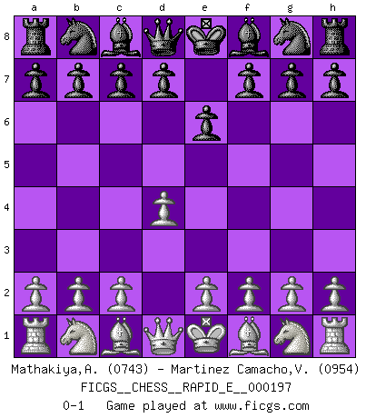 Last move : 0-1 2018 January 24 13:24:56 [Event "FICGS__CHESS__RAPID_E__000197"] [Site "FICGS"] [Date "2018.01.05"] [Round "1"] [White "Mathakiya,Azaz"] [Black "Martinez Camacho,Victor Hugo"] [Result "0-1"] [WhiteElo "0743"] [BlackElo "0954"] 1.d4 e6 0-1 Queen's pawn Player Black won this chess game. Follow this game move after move (download)Not only will I predict his triumph over Botvinnik, but I'll go further and say that he'll probably be the greatest Chess player that ever lived. (John Collins) Der beste Spieler in einem Turnier gewinnt es nie. Er landet auf Platz zwei oder drei. (Siegbert Tarrasch) Coloca el contenido de las piezas del Ajedrez en un sombrero, agitalo vigorosamente, arrojalas en un tablero desde una altura de 30 centimetros y así obtendras el estilo de Steinitz. (H. E. Bird) Vous m'avez demandé de vous exposer quel est le fondement de la prière. Je ne fais que préparer les pièces du jeu sur la table... Nous sera-t-il permis d'en adopter les règles et si nous les appliquons scrupuleusement nous ne tarderons pas à faire mat le Roi divin ! Il ne pourra échapper à nos mains. (Sainte Thérèse d'Avila, Chemin de perfection) Do not put your faith in what statistics say until you have carefully considered what they do not say. (William W. Watt)