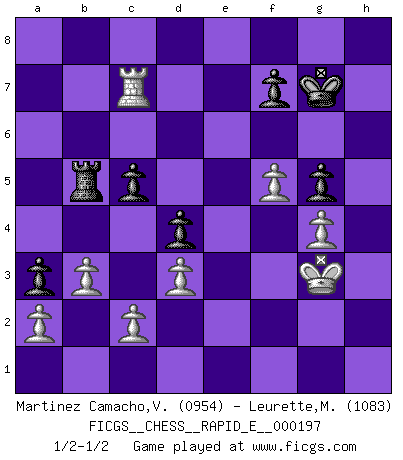 Last move : 1/2-1/2 2018 February 21 14:14:4 [Event "FICGS__CHESS__RAPID_E__000197"] [Site "FICGS"] [Date "2018.01.05"] [Round "1"] [White "Martinez Camacho,Victor Hugo"] [Black "Leurette,Marc-Antoine"] [Result "1/2-1/2"] [WhiteElo "0954"] [BlackElo "1083"] 1.e4 e5 2.Nf3 Nc6 3.Bb5 Nf6 4.O-O Nxe4 5.d3 Nd6 6.Bxc6 bxc6 7.Nxe5 Ba6 8.Re1 Be7 9.Nc3 O-O 10.Bd2 Bf6 11.Qg4 Bc8 12.Nc4 Nxc4 13.Qxc4 Bb7 14.Ne4 d5 15.Qb4 a5 16.Qxb7 dxe4 17.Rxe4 Qd6 18.Qb3 Rfb8 19.Qc4 Qd5 20.Qxd5 cxd5 21.R4e1 a4 22.Rab1 d4 23.b3 a3 24.Re4 c5 25.g3 g5 26.Rbe1 h6 27.f4 g4 28.Kg2 Kg7 29.h3 gxh3+ 30.Kxh3 Kg6 31.Rf1 Re8 32.Rfe1 Rxe4 33.Rxe4 Bg7 34.g4 Bf6 35.f5+ Kh7 36.Re1 Bg5 37.Bxg5 hxg5 38.Re7 Kg7 39.Rc7 Ra5 40.Kg3 Rb5 1/2-1/2 Ruy Lopez : Berlin defense, Open variation Kingside Castling by player White (move 4) Kingside Castling by player Black (move 9) This chess game ended in a draw. Follow this game move after move (download)In complicated positions, Bobby Fischer hardly had to be afraid of anybody. (Paul Keres) Fischer ist das größte Genie, das je vom Schachhimmel heruntergestiegen ist. (Mikhail Nekhemyevich Tal) Para mi, el Ajedrez es la vida y cada partida es como una nueva vida. Todo jugador de Ajedrez suele vivir muchas vidas durante su vida. (Eduard Gufeld) Des points faibles ou des trous dans la position de l'adversaire doivent être occupés par des pièces et non pas par des pions. (Siegbert Tarrasch) Life is like a play: it's not the length but the excellence of the acting that matters. (Seneca)
