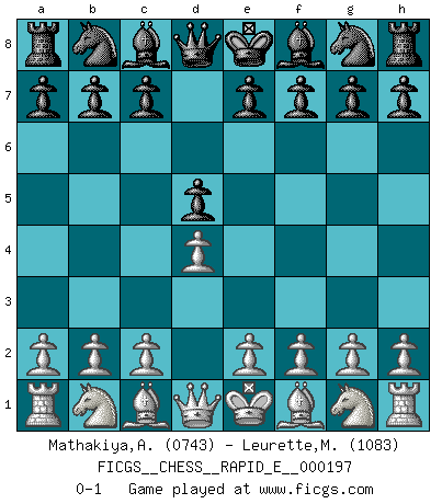 Last move : 0-1 2018 January 24 13:25:25 [Event "FICGS__CHESS__RAPID_E__000197"] [Site "FICGS"] [Date "2018.01.05"] [Round "1"] [White "Mathakiya,Azaz"] [Black "Leurette,Marc-Antoine"] [Result "0-1"] [WhiteElo "0743"] [BlackElo "1083"] 1.d4 d5 0-1 Queen's pawn game Player Black won this chess game. Follow this game move after move (download)Only the player with the initiative has the right to attack. (Wilhelm Steinitz) Verschiedene, sehr schätzbare und im Laufe des Lebens nützliche Eigenschaften des Geistes können durch das Schachspiel erworben und gekräftigt werden, so dass sie zu Gewohnheiten werden, die uns nie im Stich lassen. (Benjamin Franklin) Con el tiempo, empecé a progresar en partidas decisivas. Tal vez porque me di cuenta de una simple verdad: no solo estaba yo nervioso sino también mi oponente. (Mikhail Tal) Les Echecs ont trois composantes : le temps, l'espace et le matériel en dernier. (Mikhail Tal) Everything in life is luck. (Donald Trump)