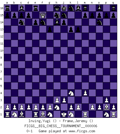 Last move : 0-1 2007 May 6 13:12:10 [Event "FICGS__BIG_CHESS__TOURNAMENT__000006"] [Site "FICGS"] [Date "2007.04.20"] [Round "1"] [White "Inving,Yugi"] [Black "Frame,Jeremy"] [Result "0-1"] [WhiteElo ""] [BlackElo ""] 1.m2-m4 k15-k13 2.p2-p3 g15-g13 3.o1-p2 b16-c14 4.j2-k4 l15-l13 5.h1-o7 p16-o14 6.o7-f15 g16-f14 7.l1-q6 e15-e14 8.q6-h14 f16-h14 0-1 Follow this game move after move (download)It is not enough to be a good player... you must also play well. (Siegbert Tarrasch) Sehr viele beherrschen heutzutage das große Einmalseins des Schachspiels und kennen sogar dessen Logarithmentafeln auswendig - deshalb sollte man hin und wieder zu beweisen trachten, dass zwei mal zwei auch fünf sein kann. (Mikhail Nekhemyevich Tal) Ser exitoso en el Ajedrez te permite descubrir tu propia personalidad. Eso es lo que deseo para los niños de mi clase. (Saudin Robovic) Les échecs c'est le défi de l'alpiniste, toujours plus haut, prêt à tout pour monter à l'assaut du Roi ennemi. Les échecs, c'est de la musique en mouvement, un ballet majestueux pour les yeux. C'est de la poésie composée par les fantômes du passé qui au même titre que Rimbaud ou Verlaine méritent notre admiration. Les échecs, c'est de la peinture ou le moindre mouvement modifie le tableau pour en faire un Picasso ou un Van Gogh. Les échecs, c'est tout et rien, c'est la vie et la mort. Jjulie33 sur le forum de France-Echecs. To err is human, to shift the blame on someone else is tactical. (Mladen Jankovic)