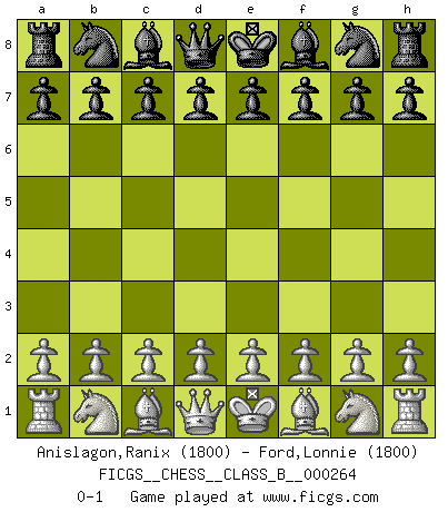 Last move : 0-1 2018 April 23 21:46:16 [Event "FICGS__CHESS__CLASS_B__000264"] [Site "FICGS"] [Date "2018.03.14"] [Round "1"] [White "Anislagon,Ranix"] [Black "Ford,Lonnie"] [Result "0-1"] [WhiteElo "1800"] [BlackElo "1800"] 0-1 This chess game has been lost on time (started : 2018.03.14 20:5:59) Player Black won this chess game. Follow this game move after move (download)I had a toothache during the first game. In the second game I had a headache. In the third game it was an attack of rheumatism. In the fourth game, I wasn't feeling well. And in the fifth game? Well, must one have to win every game ? (Siegbert Tarrasch) Ich könnte leicht behaupten: Ja,ja, Leonid Breschnew wollte nicht, daß ich Weltmeister werde. In der Tat war die Sache komplizierter. (Viktor Kortschnoi) El Ajedrez no es como la vida... ¡tiene reglas!. (Mark Pasternak) Des combinaisons [dans le jeu d'échecs] pareilles à des mélodies. Je crois entendre pour ainsi dire la musique des coups... (Vladimir Nabokov) It's not enough to succeed. Others must fail. (Gore Vidal)