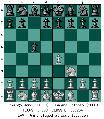 Last move : 1-0 2018 February 15 2:19:34 [Event "FICGS__CHESS__CLASS_B__000264"] [Site "FICGS"] [Date "2018.01.05"] [Round "1"] [White "Domingo,Jordi"] [Black "Cedeno,Antonio"] [Result "1-0"] [WhiteElo "1828"] [BlackElo "1800"] 1.e4 c5 2.Nf3 1-0 This chess game has been lost on time (started : 2018.01.05 15:6:57) Sicilian defense Player White won this chess game. Follow this game move after move (download)A good sacrifice is one that is not necessarily sound but leaves your opponent dazed and confused. (Rudolph Spielmann) Ich würde mich als ganz normalen Jungen bezeichnen [Im Alter von 12]. (Sergej Karjakin) Cuando tengas duda... ¡juega al Ajedrez!. (Tevis) J'apprécie les joueurs d'est-indienne, c'est grâce à eux que je nourris ma famille depuis tant d'années. (Petrosian) A belief is an idea the mind possesses, an idea that possesses the mind. (Robert Oxden Bolton)
