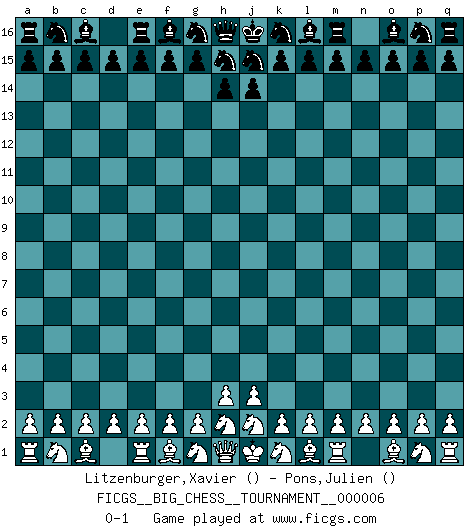 Last move : 0-1 2007 April 20 14:57:33 [Event "FICGS__BIG_CHESS__TOURNAMENT__000006"] [Site "FICGS"] [Date "2007.04.20"] [Round "1"] [White "Litzenburger,Xavier"] [Black "Pons,Julien"] [Result "0-1"] [WhiteElo ""] [BlackElo ""] 0-1 Follow this game move after move (download)Every Pawn is a potential Queen. (James Mason) Schach sollte überall auf der Welt Schulfach werden. Es fördert die geistige Auseinandersetzung. Es lehrt die Demut in der Niederlage. (Garry Kasparov) Cuando estes solo, cuando te sientas un extraño en el mundo, juega al Ajedrez. Esto levantará tu espiritu y será tu consejero de guerra. (Aristóteles) Vouloir jouer aux échecs contre soi-même est aussi paradoxal que vouloir marcher sur son ombre. (Stefan Zweig) A good teacher is like a candle - it consumes itself to light the way for others. (Author unknown)