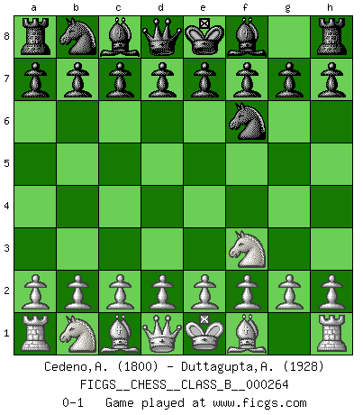 Last move : 0-1 2018 February 15 2:19:34 [Event "FICGS__CHESS__CLASS_B__000264"] [Site "FICGS"] [Date "2018.01.05"] [Round "1"] [White "Cedeno,Antonio"] [Black "Duttagupta,Aniruddha"] [Result "0-1"] [WhiteElo "1800"] [BlackElo "1928"] 1.Nf3 Nf6 0-1 This chess game has been lost on time (started : 2018.01.05 15:6:57) Reti Opening Player Black won this chess game. Follow this game move after move (download)All I want to do, ever, is just play Chess. (Bobby Fischer) Man wirke der falschen Auffassung entgegen, als ob jeder Zug Unmittelbares zu leisten habe; auch Werte- und Ruhezüge haben ihre Existenzberechtigung. (Aaron Nimzowitsch) La vida es como un juego de Ajedrez, cambiando con cada movimiento. (Proverbio Chino) Aidez vos pièces, elles vous aideront. (Paul Morphy) There are three kinds of lies: lies, damned lies and statistics. (Mark Twain)