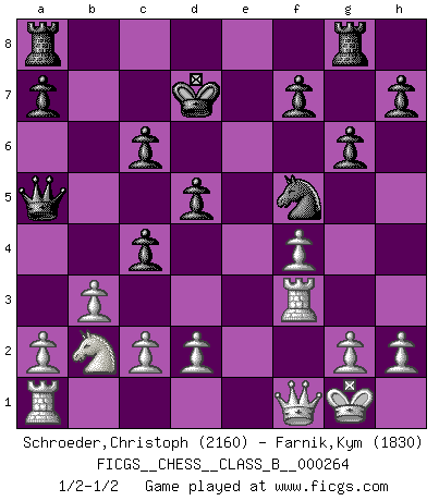 Last move : 1/2-1/2 2018 January 8 1:56:1 [Event "FICGS__CHESS__CLASS_B__000264"] [Site "FICGS"] [Date "2018.01.05"] [Round "1"] [White "Schroeder,Christoph"] [Black "Farnik,Kym"] [Result "1/2-1/2"] [WhiteElo "2160"] [BlackElo "1830"] 1.e4 c5 2.Nc3 Nc6 3.f4 e6 4.Nf3 d5 5.Bb5 Nge7 6.exd5 exd5 7.Qe2 g6 8.Qe5 Rg8 9.Bxc6+ bxc6 10.O-O Bg4 11.b3 Bxf3 12.Rxf3 Kd7 13.Bb2 Bg7 14.Qe2 Nf5 15.Qf1 Qa5 16.Na4 Bxb2 17.Nxb2 c4 1/2-1/2 Comment by player 1 : Christoph Schroeder : 10.-Bg4! is a new move (so far only 10.-Bg7 has been played after which 11.Qe1! gives White an advantage) that seems to equalise. Comment by player 2 : Kym Farnik : 10.-Bg4! is to get rid the N on f3 and combined with 15.-Qa5 looking after c5 allowing for counter play. Thanks for the game. Sicilian : Grand Prix attack Kingside Castling by player White (move 10) This chess game ended in a draw. Follow this game move after move (download)Bobby Fischer's current state of mind is indeed a tragedy. One of the world's greatest Chess players - the pride and sorrow of American Chess. (Frank Brady) Du musst nicht gut spielen, es reicht, wenn du besser spielst als dein Gegner. (Anonymous) Uno no tiene que jugar muy bien, es suficiente jugar mejor que el oponente. (Siegbert Tarrasch) RxDa4 pat (...) There are two types of people in this world, good and bad. The good sleep better, but the bad seem to enjoy the waking hours much more. (Woody Allen)