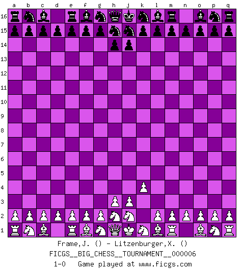Last move : 1-0 2007 April 20 14:57:45 [Event "FICGS__BIG_CHESS__TOURNAMENT__000006"] [Site "FICGS"] [Date "2007.04.20"] [Round "1"] [White "Frame,Jeremy"] [Black "Litzenburger,Xavier"] [Result "1-0"] [WhiteElo ""] [BlackElo ""] 1.k2-k4 1-0 Follow this game move after move (download)If your opponent cannot do anything active, then don't rush the position; instead you should let him sit there, suffer, and beg you for a draw. (Jeremy Silman) In Buenos Aires ist es nicht mein vorrangiges Ziel ein starkes Turnier zu organisieren, sondern ein Turnier für Gentlemen. Ich würde nie Kamsky einladen. Ich mag keine Probleme. (Miguel Najdorf) Si tu oponente no puede hacer nada activo, entonces no apures la posición; En vez de eso, dejalo estar sentado ahí, sufriendo y rogandote por un empate. (Jeremy Silman) La tactique, c'est ce que vous faites quand il y a quelque chose à faire; la stratégie, c'est ce que vous faites quand il n'y a rien à faire. (Savielli Tartacower) Horse racing is animated roulette. (Roger Kahn)
