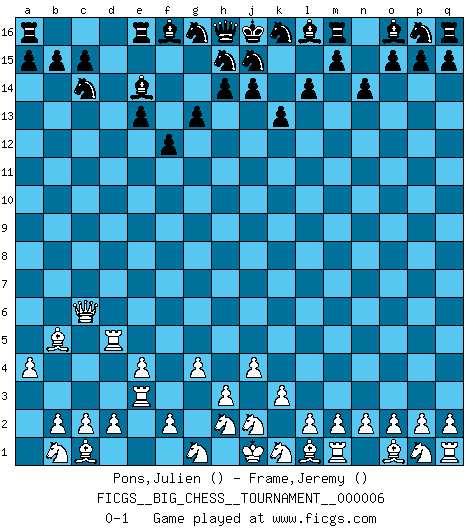 Last move : 0-1 2007 May 8 17:6:7 [Event "FICGS__BIG_CHESS__TOURNAMENT__000006"] [Site "FICGS"] [Date "2007.04.20"] [Round "1"] [White "Pons,Julien"] [Black "Frame,Jeremy"] [Result "0-1"] [WhiteElo ""] [BlackElo ""] 1.k2-k3 k15-k14 2.j3-j4 g15-g14 3.g2-g4 l15-l14 4.h1-c6 b16-c14 5.a2-a4 f15-f13 6.a1-a3 n15-n14 7.e2-e4 e15-e13 8.f1-b5 k14-k13 9.e1-e3 d15-d13 10.a3-d3 f13-f12 11.d3-d13 c16-e14 12.d13-d5 g14-g13 0-1 Follow this game move after move (download)When you don't know what to play, wait for an idea to come into your opponent's mind. You may be sure that idea will be wrong. (Siegbert Tarrasch) Der Verteidiger gebe der Gewalt nach, aber nur der Gewalt. Er schaffe sich nicht freiwillig, etwa aus Blindheit oder aus Schrecken, irgendwelche Schwächen. Er lasse sich nicht bluffen. (Emanuel Lasker) Fischer era un maestro de claridad y un Rey del posicionamiento astuto. Sus oponentes podían ver hacia donde se dirigía pero eran impotentes para detenerlo. (Bruce Pandolfini) Pour moi, les échecs ne sont pas un jeu mais un art. (Alexandre Alekhine) The only thing that matters is the evidence. (Horatio Caine, C.S.I. Miami)