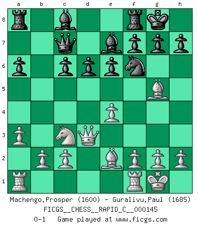Last move : 0-1 2018 March 5 16:18:8 [Event "FICGS__CHESS__RAPID_C__000145"] [Site "FICGS"] [Date "2018.01.09"] [Round "1"] [White "Machengo,Prosper"] [Black "Guralivu,Paul"] [Result "0-1"] [WhiteElo "1600"] [BlackElo "1685"] 1.e4 c5 2.Nf3 d6 3.d4 cxd4 4.Nxd4 Nf6 5.Nc3 a6 6.Be2 Nc6 7.O-O e6 8.Bg5 Be7 9.Nxc6 bxc6 10.a3 O-O 11.Qd3 Qc7 0-1 This chess game has been lost on time (started : 2018.01.09 20:25:29) Sicilian : Najdorf, Opovcensky variation Kingside Castling by player White (move 7) Kingside Castling by player Black (move 10) Player Black won this chess game. Follow this game move after move (download)You are for me the Queen on d8 and I am the Pawn on d7 !! (Eduard Gufeld) Ein Großmeister muß tausende Partien in seinem Kopf speichern, denn diese sind für Ihn, was die Worte der Muttersprache für gewöhnliche Leute sind, oder Noten für Musiker... (Garry Kasparov) Debes de llevar a tu oponente hacia un profundo y obscuro bosque donde 2+2=5, y el camino que conduce a la salida es suficientemente ancho para solamente uno. (Mikhail Tal) Shah mat. Le roi est mort. Cri de fierté d'un joueur venant de terrasser son adversaire, courtoisement, sans effusion de sang. You must do what you feel is right... of course. (Obi-Wan Kenobi in Star Wars ep.4)