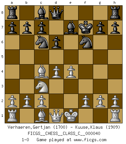Last move : 1-0 2007 May 31 17:43:39 [Event "FICGS__CHESS__CLASS_C__000040"] [Site "FICGS"] [Date "2007.04.21"] [Round "1"] [White "Verhaeren,Gertjan"] [Black "Kuuse,Klaus"] [Result "1-0"] [WhiteElo "1700"] [BlackElo "1909"] 1.e4 e5 2.Nf3 Nf6 3.Nxe5 d6 4.Nxf7 Kxf7 5.d4 Nc6 6.Nc3 Be7 7.Bc4+ 1-0 This chess game has been lost on time (started : 2007.04.21 1:29:53) Petrov : Cochrane gambit Player White won this chess game. Follow this game move after move (download)Your body has to be in top condition. Your Chess deteriorates as your body does. You can't separate body from mind. (Bobby Fischer) Mit Schach schule ich mein Gefühl für Geometrie, was für Tennis und Schach gleichermaßen wichtig ist. (Boris Becker) Nos gusta pensar. (Gary Kasparov) Toutes choses étant égales, c'est la conviction qui gagne. Alliée à une volonté de vaincre, elle sert de détonateur, suscite des idées, disperse les doutes et aide à penser clairement. (Robert Fischer) Beep ! (R2D2 in Star Wars ep.3)