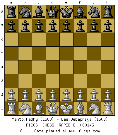 Last move : 0-1 2018 February 9 1:46:49 [Event "FICGS__CHESS__RAPID_C__000145"] [Site "FICGS"] [Date "2018.01.09"] [Round "1"] [White "Yanto,Hadhy"] [Black "Das,Debapriya"] [Result "0-1"] [WhiteElo "1500"] [BlackElo "1500"] 0-1 This chess game has been lost on time (started : 2018.01.09 20:25:29) Player Black won this chess game. Follow this game move after move (download)A sacrifice is best refuted by accepting it. (Wilhelm Steinitz) Ich kenne keine einzige Person, die behaupten würde, Garri Kasparow sei ein guter Mensch (Nigel Short) Cada Peón es una Reina en potencia. (James Mason) Botvinnik disait en comparant les échecs à la musique: Il existe une science dont le but est l'étude de l'acoustique et des sons. Mais il y a aussi un art qui se sert de l'océan des sons : c'est la musique. De toute évidence, il en est de même pour la pensée. La logique est l'étude des lois de la réflexion et les échecs reflètent, en tant qu'art, le côté logique de la réflexion, sous la forme d'images artistiques... Extrait de Fischer - Spassky, Reykjavik 1972 par Alexander & F. Wyndham (Ed. Solar), p 37. Sometimes it pays to stay in bed in Monday, rather than spending the rest of the week debugging Monday's code. (Dan Salomon)