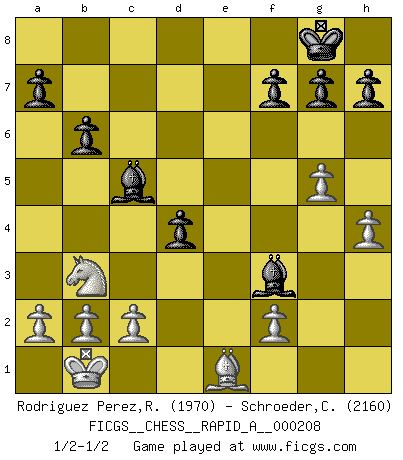 Last move : 1/2-1/2 2018 February 13 10:55:48 [Event "FICGS__CHESS__RAPID_A__000208"] [Site "FICGS"] [Date "2018.01.10"] [Round "1"] [White "Rodriguez Perez,Rene"] [Black "Schroeder,Christoph"] [Result "1/2-1/2"] [WhiteElo "1970"] [BlackElo "2160"] 1.e4 e6 2.d4 d5 3.Bd3 dxe4 4.Bxe4 Nf6 5.Bf3 c5 6.Ne2 Nc6 7.Be3 cxd4 8.Nxd4 Ne5 9.Nc3 Be7 10.Qe2 Nxf3+ 11.Qxf3 O-O 12.O-O-O Bd7 13.g4 Qa5 14.g5 Nd5 15.Nb3 Qc7 16.Nxd5 exd5 17.Kb1 Rac8 18.Nd4 Qe5 19.h4 Rfe8 20.Rhe1 Bc5 21.Nb3 d4 22.Bd2 Bc6 23.Rxe5 Bxf3 24.Rxe8+ Rxe8 25.Re1 Rxe1+ 26.Bxe1 b6 1/2-1/2 French : Schlechter variation Kingside Castling by player Black (move 11) Queenside Castling by player White (move 12) This chess game ended in a draw. Follow this game move after move (download)When the Chess game is over, the Pawn and the King go back to the same box. (Irish saying) Ich bewundere Kasparows phantasievolle Angriffssiege aus den Achtzigern und Neunzigern, aber wenn man sie mit dem Computer überprüft, nimmt der Computer in jeder zweiten Partie die Opfer an, verteidigt sich und gewinnt. (Vladimir Kramnik) Un entendimiento a fondo de las continuaciones típicas del mate, hace de las combinaciones de sacrificio mas complicadas conducirlas a ellas no solo sin dificultad, sino casi de una manera natural. (Siegbert Tarrasch) Plusieurs personnes se sont demandées comment Tal faisait pour gagner... En fait, c'est très simple ! Il met ses pièces au centre de l'échiquier et les sacrifie quelque part ! (David Bronstein) Every man's memory is his private literature. (Aldous Huxley)