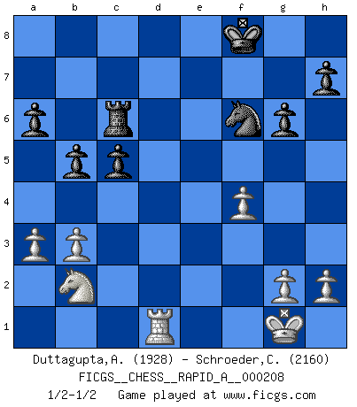 Last move : 1/2-1/2 2018 March 16 15:25:56 [Event "FICGS__CHESS__RAPID_A__000208"] [Site "FICGS"] [Date "2018.01.10"] [Round "1"] [White "Duttagupta,Aniruddha"] [Black "Schroeder,Christoph"] [Result "1/2-1/2"] [WhiteElo "1928"] [BlackElo "2160"] 1.d4 d5 2.c4 e6 3.Nc3 c6 4.e3 f5 5.Bd3 Nf6 6.Nge2 Bd6 7.f3 O-O 8.Qc2 dxc4 9.Bxc4 Kh8 10.Bd2 e5 11.Bd3 c5 12.dxe5 Bxe5 13.a3 Nc6 14.Rd1 Ne7 15.O-O Be6 16.f4 Bd6 17.b3 a6 18.Ng3 Qc8 19.Bc1 Bc7 20.Na4 b6 21.Bb2 Qe8 22.Rfe1 Qf7 23.Bc4 Bxc4 24.Qxc4 Nfd5 25.Qe2 Kg8 26.Nh5 g6 27.Ng3 Rfd8 28.Ba1 Kf8 29.Qb2 Rac8 30.Rd2 Ng8 31.Qh8 Ndf6 32.Rde2 Re8 33.e4 fxe4 34.Nxe4 Nxe4 35.Rxe4 Rxe4 36.Rxe4 Bd8 37.Re1 Rc6 38.Rd1 Bf6 39.Bxf6 Qxf6 40.Qxf6+ Nxf6 41.Nb2 b5 1/2-1/2 QGD : Semi-Slav Kingside Castling by player Black (move 7) Kingside Castling by player White (move 15) This chess game ended in a draw. Follow this game move after move (download)The passion for playing Chess is one of the most unaccountable in the world. (H.G. Wells) Bis zum Jahr 1971 verlief in meiner Schachkariere alles glatt. Dieses dramatische Match [Fischer-Taimanov 6:0] machte mein Leben zur Hölle. (Mark Taimanov) No hay otro maestro que tenga una voluntad terrífica de ganar. Al tablero, el irradía peligro y aún los oponentes mas fuertes tienden a congelarse como liebres cuando olfatean a una pantera. Aún sus debilidades son peligrosas. Con las blancas, su juego de apertura es predecible - te es posible hacer planes en su contra - pero es tan fuerte que tus planes casi nunca funcionan. En el juego medio, su precisión e invención son fabulosas y en finales, tú simplemente no le puedes vencer. (Experto Alemán anónimo) Votre seul travail dans les ouvertures est d'obtenir un milieu de partie jouable. (Lajos Portish) Mac users swear by their computers. PC users swear at their computers. (Author unknown)