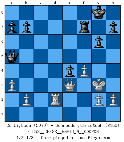 Last move : 1/2-1/2 2018 March 21 12:18:19 [Event "FICGS__CHESS__RAPID_A__000208"] [Site "FICGS"] [Date "2018.01.10"] [Round "1"] [White "Sorbi,Luca"] [Black "Schroeder,Christoph"] [Result "1/2-1/2"] [WhiteElo "2070"] [BlackElo "2160"] 1.e4 c5 2.Nf3 Nc6 3.d4 cxd4 4.Nxd4 g6 5.c4 Bg7 6.Be3 Nf6 7.Nc3 Ng4 8.Qxg4 Nxd4 9.Qd1 e5 10.Nb5 d6 11.Nxd4 exd4 12.Bxd4 Qa5+ 13.Ke2 Be5 14.f3 f5 15.Qd3 fxe4 16.Qxe4 Be6 17.Qe3 Bxc4+ 18.Kf2 Bxf1 19.Rhxf1 O-O 20.Bxe5 dxe5 21.Rfd1 Rac8 22.Rd7 Rf7 23.Rad1 Rc2+ 24.Kg3 Qb5 25.R1d2 Rxd2 26.Rxd2 e4 27.f4 Qa5 28.a3 1/2-1/2 Sicilian : Accelerated Fianchetto, Breyer variation Kingside Castling by player Black (move 19) This chess game ended in a draw. Follow this game move after move (download)Any material change in a position must come about by mate, a capture, or a Pawn promotion. (Purdy) Alle offensichtlichen Züge sehen nach dem Spiel in der Analyse verdächtig aus. (Viktor Kortschnoi) Combinaciones deslumbrantes son para la mayoría, mover madera es para los pocos. (Georg Kieninger) D'abord les bases : Jouez et étudiez, puis étudiez et jouez, ensuite jouez et étudiez, puis étudiez et jouez. Deuxièmement : Donnez toujours le meilleur de vous-même ! (Ken Smith) Treat your password like your toothbrush. Don't let anybody else use it, and get a new one every six months. (Clifford Stoll)
