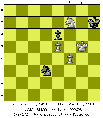 Last move : 1/2-1/2 2018 August 12 17:45:19 [Event "FICGS__CHESS__RAPID_A__000208"] [Site "FICGS"] [Date "2018.01.10"] [Round "1"] [White "van Dijk,Erik L."] [Black "Duttagupta,Aniruddha"] [Result "1/2-1/2"] [WhiteElo "1949"] [BlackElo "1928"] 1.e4 c6 2.d4 d5 3.e5 Bf5 4.h4 h5 5.c4 e6 6.Nc3 Ne7 7.Nge2 Nd7 8.Ng3 Bg6 9.cxd5 cxd5 10.Bg5 Qb6 11.Bb5 Rc8 12.O-O a6 13.Bxd7+ Kxd7 14.Qd2 Nc6 15.Nge2 Kc7 16.a3 Kb8 17.b4 Be7 18.Bxe7 Nxe7 19.Rfc1 Rc4 20.Na4 Qa7 21.Rxc4 dxc4 22.Qg5 Re8 23.Rc1 Nc6 24.Qf4 Rd8 25.d5 Rxd5 26.Rxc4 Bd3 27.Rc5 Rd7 28.Qf3 Bxe2 29.Qxe2 g6 30.Qf3 Nd8 31.Qf4 Nc6 32.Qh6 Rd1+ 33.Kh2 Ka8 34.Qe3 Rd4 35.Kh3 Rd5 36.Qc3 Rd1 37.g3 Kb8 38.Kg2 Rd7 39.Rc4 Rd5 40.Qc1 Rd8 41.Rf4 Rd7 42.Qc3 Nd8 43.Nc5 Rd5 44.Qf3 b5 45.a4 Qa8 46.axb5 axb5 47.Kh2 Qc6 48.Qe3 Rd1 49.Ne4 Rd5 50.Nc3 Rd7 51.Rf3 Nb7 52.Qe2 Qc4 53.Qxc4 bxc4 54.Rf4 Rc7 55.Rd4 Rc8 56.Rd7 Rc7 57.Rd2 Rc8 58.Rd4 Nd8 59.f4 Ka8 60.Kg2 Kb7 61.Ne4 Ka6 62.Nd6 Rc7 63.Rxc4 Rxc4 64.Nxc4 Kb5 65.Nd6+ Kxb4 66.g4 Kc5 67.gxh5 gxh5 68.Ne4+ Kb6 69.Kg3 Kc7 70.Nf6 Nc6 71.Nxh5 Kd8 72.Kg4 Ke8 73.Ng3 Kf8 74.Kg5 Kg8 75.Kf6 Nb4 76.Ne4 Nd5+ 77.Kg5 Nb4 78.h5 Nc6 79.Nd6 Nb4 80.h6 Nd3 81.h7+ Kxh7 82.Nxf7 1/2-1/2 Caro-Kann : Advance variation Kingside Castling by player White (move 12) 10 pieces endgame at move 67 : White KNPPP , Black KNPPP WHITE : King + 1 Knight 3 Pawns BLACK : King + 1 Knight 3 Pawns 9 pieces endgame at move 71 : White KNPPP , Black KNPP WHITE : King + 1 Knight 3 Pawns BLACK : King + 1 Knight 2 Pawns 8 pieces endgame at move 81 : White KNPP , Black KNPP WHITE : King + 1 Knight 2 Pawns BLACK : King + 1 Knight 2 Pawns 7 pieces endgame at move 82 : White KNPP , Black KNP WHITE : King + 1 Knight 2 Pawns BLACK : King + 1 Knight 1 Pawn This chess game ended in a draw. Follow this game move after move (download)Chess, like any creative activity, can exist only through the combined efforts of those who have creative talent, and those who have the ability to organize their creative work. (Mikhail Botvinnik) Wenn du nicht weißt was du tun sollst, warte bis dein Gegner eine Idee hat. Sie wird sicher schlecht sein. (Siegbert Tarrasch) Los Peones son nacidos libres, y aún así, se encuentran por doquier encadenados. (Rick Kennedy) Les échecs, c'est la lutte contre l'erreur. (Johannes Zukertort) I believe in luck. How else can you explain the success of those you dislike ? (Jean Cocteau)