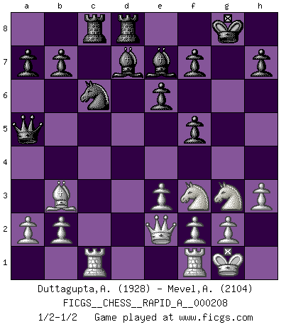 Last move : 1/2-1/2 2018 April 2 22:59:2 [Event "FICGS__CHESS__RAPID_A__000208"] [Site "FICGS"] [Date "2018.01.10"] [Round "1"] [White "Duttagupta,Aniruddha"] [Black "Mevel,Alberic"] [Result "1/2-1/2"] [WhiteElo "1928"] [BlackElo "2104"] 1.d4 Nf6 2.Bg5 d5 3.e3 c5 4.Bxf6 gxf6 5.dxc5 Nc6 6.Bb5 e6 7.c4 dxc4 8.Nd2 Bxc5 9.Ngf3 Bd7 10.Rc1 O-O 11.O-O Be7 12.Bxc4 Rc8 13.Ne4 Qc7 14.Bb3 Rfd8 15.Qe2 f5 16.Ng3 Qa5 17.h3 1/2-1/2 Trompowsky attack (Ruth, Opovcensky Opening) Kingside Castling by player Black (move 10) Kingside Castling by player White (move 11) This chess game ended in a draw. Follow this game move after move (download)Chess is a sea in which a gnat may drink and an elephant may bathe. (Hindu proverb) Lisa Lane, amerikanische Schachmeisterin, hatte Fischer einmal als stärksten lebenden Spieler bezeichnet. Antwort: Das ist richtig, aber Lisa Lane ist eigentlich nicht in der Lage, das zu beurteilen. (Robert James Fischer) Bobby Fischer es el mas grande genio de Ajedrez de todos los tiempos. (Alexander Kotov) Il (Jacob Murray) ne joue pas pour le bon coup, mais pour le meilleur. (Eloi Relange) Man is reluctant to give credit for intelligence to anyone, except his enemies. (Albert Einstein)