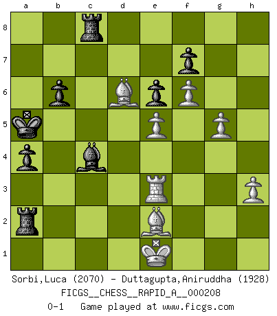 Last move : 0-1 2018 June 6 23:1:34 [Event "FICGS__CHESS__RAPID_A__000208"] [Site "FICGS"] [Date "2018.01.10"] [Round "1"] [White "Sorbi,Luca"] [Black "Duttagupta,Aniruddha"] [Result "0-1"] [WhiteElo "2070"] [BlackElo "1928"] 1.e4 e6 2.d4 d5 3.Nc3 Bb4 4.e5 Ne7 5.a3 Bxc3+ 6.bxc3 c5 7.Qg4 cxd4 8.Qxg7 Rg8 9.Qxh7 Qc7 10.Ne2 Nbc6 11.f4 dxc3 12.Qd3 d4 13.Nxd4 Nxd4 14.Qxd4 Bd7 15.Rg1 Nf5 16.Qf2 Qc6 17.Bd3 Qd5 18.Rb1 Bc6 19.Rb3 O-O-O 20.Rxc3 Kb8 21.g4 Nd4 22.Rg3 Qh1+ 23.Bf1 b6 24.a4 Qe4+ 25.Rge3 Qd5 26.Rcd3 Bxa4 27.c3 Nc2+ 28.Qxc2 Bxc2 29.Rxd5 Rxd5 30.Be2 Ra5 31.c4 Ra1 32.Kd2 Ra2 33.Ke1 Rh8 34.h3 a5 35.Ba3 a4 36.Bd6+ Kb7 37.Bf3+ Ka6 38.Be2 Ka5 39.f5 Rc8 40.f6 Bb3 41.g5 Bxc4 0-1 French : Winawer, Advance variation Queenside Castling by player Black (move 19) Player Black won this chess game. Follow this game move after move (download)The battle for the ultimate truth will never be won. And that's why Chess is so fascinating. (Hans Kmoch) Die starken Figuren des Gegners muss man abtauschen. (José Raúl Capablanca) El Ajedrez lo es todo: arte, ciencia y deporte. (Anatoly Karpov) Botvinnik disait en comparant les échecs à la musique: Il existe une science dont le but est l'étude de l'acoustique et des sons. Mais il y a aussi un art qui se sert de l'océan des sons : c'est la musique. De toute évidence, il en est de même pour la pensée. La logique est l'étude des lois de la réflexion et les échecs reflètent, en tant qu'art, le côté logique de la réflexion, sous la forme d'images artistiques... Extrait de Fischer - Spassky, Reykjavik 1972 par Alexander & F. Wyndham (Ed. Solar), p 37. It is a good thing for an uneducated man to read books of quotations. (Winston Churchill)