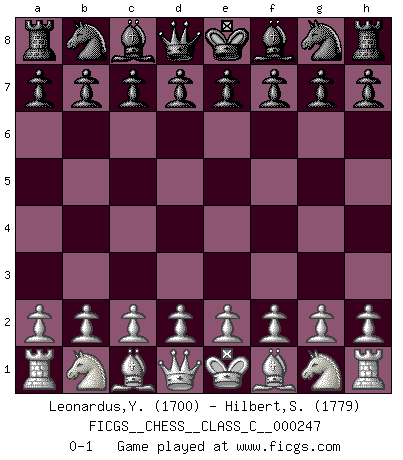 Last move : 0-1 2018 February 20 2:40:34 [Event "FICGS__CHESS__CLASS_C__000247"] [Site "FICGS"] [Date "2018.01.11"] [Round "1"] [White "Leonardus,Yohanes"] [Black "Hilbert,Stephan J."] [Result "0-1"] [WhiteElo "1700"] [BlackElo "1779"] 0-1 This chess game has been lost on time (started : 2018.01.11 1:23:37) Player Black won this chess game. Follow this game move after move (download)The hardest game to win is a won game. (Emanuel Lasker) Privat ist Kortschnoi kein schlechter Mensch, sehr sympathisch. Aber während des Spiels ist er grausam. Er will dich töten. (Miguel Najdorf) Una victoria por una combinación errónea, aunque sea espectacular, me llena de horror artístico. (Wilhelm Steinitz) Les échecs sont un jeu terrible. Si vous n'avez pas le centre, votre adversaire a une position plus libre. Par contre, si vous avez le centre, alors vous avez vraiment quelque chose pour laquelle vous inquiéter ! (Siegbert Tarrasch) Tree pose grows confidence. It roots me to this world. (Terri Guillemets)