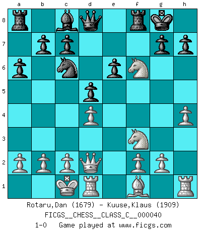 Last move : 1-0 2007 June 27 15:0:28 [Event "FICGS__CHESS__CLASS_C__000040"] [Site "FICGS"] [Date "2007.04.21"] [Round "1"] [White "Rotaru,Dan"] [Black "Kuuse,Klaus"] [Result "1-0"] [WhiteElo "1679"] [BlackElo "1909"] 1.d4 f5 2.Nc3 Nf6 3.Bg5 e6 4.e4 fxe4 5.Nxe4 Be7 6.Bxf6 Bxf6 7.Nf3 O-O 8.Qd2 Nc6 9.O-O-O a6 10.h4 d5 11.Nxf6+ 1-0 Dutch Kingside Castling by player Black (move 7) Queenside Castling by player White (move 9) Player White won this chess game. Follow this game move after move (download)I thought the most common mistake [in chess] was the first one: Learning the game :P (Garvin Gray, FICGS forum) Wie, soll nun auch die Opposition abgeschafft werden? Ja, es tut mir leid, Ihnen diesen Schmerz nicht ersparen zu können. (Aaron Nimzowitsch) El Ajedrez es un cuento de Hadas de las 1001 metidas de pata. (Savielly Tartakower) La menace est plus forte que l'exécution. (Aaron Nimzovitch) Creativity involves breaking out of established patterns in order to look at things in a different way. (Edward De Bono)