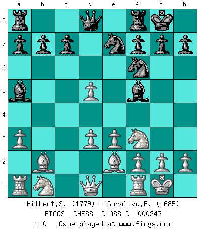 Last move : 1-0 2018 May 16 23:25:28 [Event "FICGS__CHESS__CLASS_C__000247"] [Site "FICGS"] [Date "2018.01.11"] [Round "1"] [White "Hilbert,Stephan J."] [Black "Guralivu,Paul"] [Result "1-0"] [WhiteElo "1779"] [BlackElo "1685"] 1.b4 e5 2.Bb2 Bxb4 3.Bxe5 Nf6 4.c4 d6 5.Bb2 O-O 6.e3 Nc6 7.Nf3 Bd7 8.a3 Ba5 9.Be2 Bf5 10.O-O d5 11.cxd5 Ne7 12.d3 1-0 Polish (Sokolsky) opening Kingside Castling by player Black (move 5) Kingside Castling by player White (move 10) Player White won this chess game. Follow this game move after move (download)If a ruler does not understand Chess, how can he rule over a kingdom ? (King Khusros II) Ein Remis kann durch Wiederholung von drei Zügen oder durch einen schlechte Zug erreicht werden. (Savielly Grigorievitsch Tartakower) Debemos de asegurarnos de que el Ajedrez no se convierta en un lenguaje muerto, muy interesante, pero solo para un grupo muy pequeño. (Sytze Faber) Ce qui est bien, c'est d'avoir tout un tas de pièces en prise : l'adversaire ne peut en prendre qu'une à la fois. Cité par Thierry Audin. After growing wildly for years, the field of computing appears to be reaching its infancy. (John Pierce)