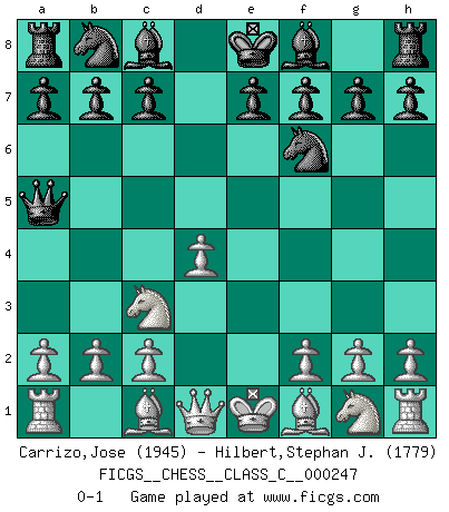 Last move : 0-1 2018 March 18 5:44:36 [Event "FICGS__CHESS__CLASS_C__000247"] [Site "FICGS"] [Date "2018.01.11"] [Round "1"] [White "Carrizo,Jose"] [Black "Hilbert,Stephan J."] [Result "0-1"] [WhiteElo "1945"] [BlackElo "1779"] 1.e4 d5 2.exd5 Qxd5 3.Nc3 Qa5 4.d4 Nf6 0-1 This chess game has been lost on time (started : 2018.01.11 1:23:37) Scandinavian (centre counter) defense Player Black won this chess game. Follow this game move after move (download)I believe that Chess possesses a magic that is also a help in advanced age. A rheumatic knee is forgotten during a game of Chess and other events can seem quite unimportant in comparison with a catastrophe on the chessboard. (Vlastimil Hort) Ivan Sokolov treibt mich als Beifahrer an mit go Loeky go - . (Loek van Wely) Personalmente, yo prefiero mirar hacia el futuro en donde un programa de computadora gane el título mundial de Ajedrez. La humanidad necesita una lección de humildad. (Richard Dawkings) C'est la seule position que je connaisse où les deux camps sont mals. Propos prêtés à V. Anand. He who laughs last probably does not get the joke. (Unknown)