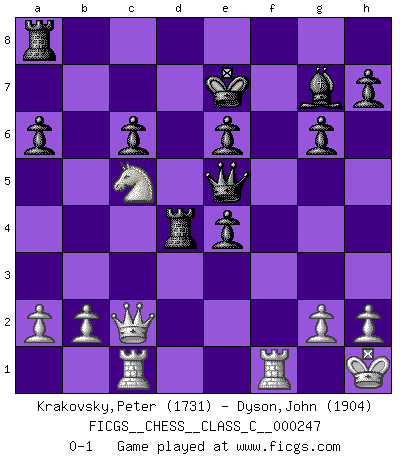 Last move : 0-1 2018 July 30 20:50:26 [Event "FICGS__CHESS__CLASS_C__000247"] [Site "FICGS"] [Date "2018.01.11"] [Round "1"] [White "Krakovsky,Peter"] [Black "Dyson,John"] [Result "0-1"] [WhiteElo "1731"] [BlackElo "1904"] 1.e4 c6 2.d4 d5 3.e5 Bf5 4.Nf3 e6 5.Be2 c5 6.Be3 cxd4 7.Nxd4 Ne7 8.O-O Nbc6 9.Bb5 a6 10.Bxc6+ bxc6 11.c4 Qd7 12.Nc3 dxc4 13.Na4 Nd5 14.Nxf5 exf5 15.Rc1 c3 16.Nxc3 Nxe3 17.fxe3 g6 18.Na4 Qc7 19.e6 fxe6 20.Qd4 Bg7 21.Qc4 Ke7 22.e4 Rhd8 23.Nc5 Qe5 24.Kh1 Rd4 25.Qc2 fxe4 0-1 This chess game has been lost on time (started : 2018.01.11 1:23:37) Caro-Kann : Advance variation Kingside Castling by player White (move 8) Player Black won this chess game. Follow this game move after move (download)A good player is always lucky. (Jose Raul Capablanca) Ein Schachgenie ist jemand der verdammt gut Schach spielt. (Jonathan Levitt) Ayuda a tus piezas para que ellas te puedan ayudar. (Paul Morphy) Les échecs sont un jeu par leur forme, un art par leur essence et une science par sa difficulté d'acquisition. Ils peuvent vous procurer autant de plaisir qu'un bon livre ou une belle musique, mais vous n'aurez une réelle joie que si vous arrivez à bien jouer. (Tigran Petrosian) Good decisions come from experience, and experience comes from bad decisions. (Anonymous)