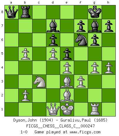 Last move : 1-0 2018 May 3 22:33:23 [Event "FICGS__CHESS__CLASS_C__000247"] [Site "FICGS"] [Date "2018.01.11"] [Round "1"] [White "Dyson,John"] [Black "Guralivu,Paul"] [Result "1-0"] [WhiteElo "1904"] [BlackElo "1685"] 1.Nf3 Nf6 2.c4 c5 3.Nc3 Nc6 4.d4 e6 5.d5 Nd4 6.Nxd4 cxd4 7.Qxd4 d6 8.e4 e5 9.Qd1 g6 10.Be2 Bg7 11.Be3 O-O 12.g4 Bd7 13.h4 Qc8 14.Rg1 a6 15.a4 b5 16.axb5 axb5 17.Rxa8 Qxa8 18.cxb5 Rb8 19.f3 1-0 This chess game has been lost on time (started : 2018.01.11 1:23:37) Reti Opening Kingside Castling by player Black (move 11) Player White won this chess game. Follow this game move after move (download)Becoming successful at Chess allows you to discover your own personality. That's what I want for the kids I teach. (Saudin Robovic) Kombinieren und Schwarzhandel gehören verboten. (Savielly Grigorievitsch Tartakower) ¡Examina movidas que hagan daño! Un buen ojo for movidas desvastantes es mucho mas importante que el conocimiento de principios estratégicos. (Purdy) Si rien de grave n'est détecté lors de l'analyse d'une position, on joue alors le coup. Seconde règle de Blumenfeld. Convictions are more dangerous enemies of truth than lies. (Friedrich Nietzsche)