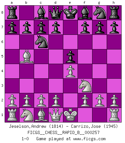 Last move : 1-0 2018 February 17 14:26:57 [Event "FICGS__CHESS__RAPID_B__000257"] [Site "FICGS"] [Date "2018.01.12"] [Round "1"] [White "Jeselson,Andrew"] [Black "Carrizo,Jose"] [Result "1-0"] [WhiteElo "1814"] [BlackElo "1945"] 1.e4 e5 2.Nf3 Nc6 3.Bb5 1-0 This chess game has been lost on time (started : 2018.01.12 19:22:23) Ruy Lopez (Spanish Opening) Player White won this chess game. Follow this game move after move (download)Every Pawn is a potential Queen. (James Mason) Schon mancher Spieler hat aufgegeben, um zu vermeiden, daß er eine Figur verliert. (Savielly Grigorievitsch Tartakower) El jugador táctico sabe que hacer cuando hay algo que hacer; mientras que el estratega sabe que hacer cuando no hay nada que hacer. (Gerald Abrahams) Les Echecs sont et restent toujours un combat, un combat intégral comme la boxe, la lutte ou un autre sport, et où il doit y avoir un vainqueur et un vaincu. (Joseph Emil Diemer) Begin at the beginning and go on till you come to the end; then stop. (Lewis Carrol, Alice in Wonderland)