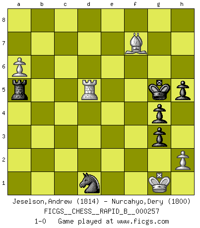 Last move : 1-0 2018 April 10 5:59:28 [Event "FICGS__CHESS__RAPID_B__000257"] [Site "FICGS"] [Date "2018.01.12"] [Round "1"] [White "Jeselson,Andrew"] [Black "Nurcahyo,Dery"] [Result "1-0"] [WhiteElo "1814"] [BlackElo "1800"] 1.e4 e5 2.Nf3 f6 3.Bc4 Ne7 4.Nc3 c6 5.Bb3 d5 6.exd5 cxd5 7.O-O Be6 8.d3 Nbc6 9.Ba4 d4 10.Ne4 Qa5 11.c3 Qc7 12.cxd4 O-O-O 13.dxe5 Nxe5 14.Nxe5 Qxe5 15.Be3 Kb8 16.Bb3 Nf5 17.Bc5 Bxc5 18.Nxc5 Qxc5 19.Bxe6 Nd4 20.Bh3 h5 21.Rc1 Qb5 22.Rc4 Qxb2 23.Re1 g5 24.g3 g4 25.Bg2 Rhe8 26.Re3 Rxe3 27.fxe3 Nf5 28.Qe1 Rxd3 29.Rb4 Qd2 30.Rxb7+ Kc8 31.Qxd2 Rxd2 32.Rxa7 Nxe3 33.Be4 f5 34.Bc6 Kb8 35.Ra3 Nc4 36.Ra4 Nd6 37.Bg2 Kc7 38.Ra6 Kd7 39.a4 Ke6 40.Ra8 Kf6 41.Ra6 Kg5 42.a5 Nb5 43.Rb6 Nc3 44.a6 Ra2 45.Rc6 Nd1 46.Bd5 Ra5 47.Bf7 f4 48.Rd6 fxg3 49.Rd5+ 1-0 Damiano's defense Kingside Castling by player White (move 7) Queenside Castling by player Black (move 12) Player White won this chess game. Follow this game move after move (download)When you don't know what to play, wait for an idea to come into your opponent's mind. You may be sure that idea will be wrong. (Siegbert Tarrasch) Das Schachspiel ist ein See, in welchem eine Mücke baden und ein Elefant ertrinken kann. (Emanuel Lasker) Observen a Garry Kasparov. Después de una derrota, invariablemente el gana la próxima partida. Prácticamente hace pedazos a su siguiente oponente. Eso es algo que tenemos que aprender a lograr. (Maurice Ashley) Toute estimation doit être constamment réévaluée. (Jacob Estrin) Wikichess, chess moves explained by 'experimented' players. (Thibault de Vassal)