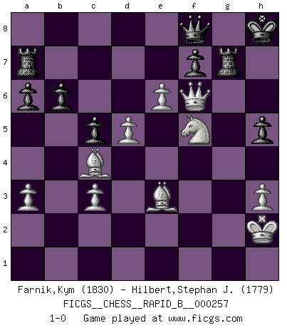 Last move : 1-0 2018 April 6 1:28:24 [Event "FICGS__CHESS__RAPID_B__000257"] [Site "FICGS"] [Date "2018.01.12"] [Round "1"] [White "Farnik,Kym"] [Black "Hilbert,Stephan J."] [Result "1-0"] [WhiteElo "1830"] [BlackElo "1779"] 1.d4 Nf6 2.c4 e6 3.Nc3 Bb4 4.a3 Bxc3+ 5.bxc3 c5 6.e3 b6 7.Bd3 Nc6 8.e4 d6 9.Nf3 O-O 10.O-O e5 11.d5 Na5 12.Rb1 Bg4 13.h3 Bh5 14.g4 Bg6 15.Qe2 h6 16.Kh2 Nh7 17.Rh1 Qd7 18.Rg1 Kh8 19.Rg3 Rfe8 20.g5 hxg5 21.Nxg5 Nf6 22.Be3 Rab8 23.Rbg1 Rb7 24.Nf3 a6 25.Nh4 Bh5 26.Qf1 Rg8 27.f4 Nxc4 28.Bxc4 Nxe4 29.Rg5 Nxg5 30.Rxg5 g6 31.fxe5 Qd8 32.Qf4 Rg7 33.e6 Ra7 34.Nf5 Rh7 35.Nxd6 Qf8 36.Qf6+ Rg7 37.Rxh5+ gxh5 38.Nf5 1-0 Kym Farnik Interesting game! Thanks! Nimzo-Indian : Saemisch, O'Kelly variation Kingside Castling by player Black (move 9) Kingside Castling by player White (move 10) Player White won this chess game. Follow this game move after move (download)Bobby just drops the pieces and they fall on the right squares. (Miguel Najdorf) Frage: Was machen Sie mit den Preisen? Anwort: Ich habe Angst, dass meine Freundin davon neue Kleider kauft. (Loek van Wely) Aunque la mayoría de la gente disfruta observar las partidas de los grandes Maestros de ataque, algunos de los jugadores mas notables en la historia han sido los jugadores silenciosos posicionales. Lentamente ellos te aplastan despojandote de tu espacio, congestionando tus piezas y dejandote virtualmente sin nada que hacer. (Yasser Seirawan) Les erreurs sont comme les malheurs, elles n'arrivent jamais seules. (Siegbert Tarrasch) To err is human, but to really foul things up requires a computer. (Farmer's Almanac, 1978)