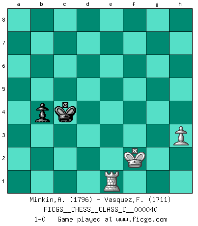 Last move : 1-0 2007 November 25 18:27:23 [Event "FICGS__CHESS__CLASS_C__000040"] [Site "FICGS"] [Date "2007.04.21"] [Round "1"] [White "Minkin,Alexander"] [Black "Vasquez,Fernando"] [Result "1-0"] [WhiteElo "1796"] [BlackElo "1711"] 1.d4 d5 2.c4 dxc4 3.Nf3 Nf6 4.Nc3 c6 5.a4 Bf5 6.Ne5 Nbd7 7.Nxc4 Qc7 8.g3 e5 9.dxe5 Nxe5 10.Bf4 Nfd7 11.Bg2 f6 12.O-O O-O-O 13.Nxe5 Nxe5 14.Qb3 Qf7 15.Qxf7 Nxf7 16.a5 a6 17.Na4 Bd6 18.e4 Bg6 19.Bxd6 Rxd6 20.Nc5 Rd2 21.b4 Rhd8 22.f4 Rb2 23.Rab1 R8d2 24.Rxb2 Rxb2 25.Bh3+ Kb8 26.Be6 Nd6 27.Rd1 Nxe4 28.Rd8+ Ka7 29.Na4 Rxb4 30.Nb6 Rxb6 31.axb6+ Kxb6 32.g4 f5 33.gxf5 Bh5 34.Rd7 Bg4 35.Rxg7 h5 36.Kg2 a5 37.h3 Be2 38.Ba2 a4 39.Rg6 Bd3 40.f6 Nd6 41.Rg7 c5 42.f7 Nxf7 43.Rxf7 c4 44.Kf2 Kc6 45.f5 Kd6 46.f6 Ke6 47.Bxc4+ Bxc4 48.Rc7 Kxf6 49.Rxc4 a3 50.Ra4 Ke5 51.Rxa3 Kd5 52.Ra5+ Kc4 53.Rxh5 b5 54.Re5 b4 55.Re1 1-0 QGA, 4.Nc3 Kingside Castling by player White (move 12) Queenside Castling by player Black (move 12) 10 pieces endgame at move 47 : White KRBPP , Black KBPPP WHITE : King + 1 Rook 1 Bishop 2 Pawns BLACK : King + 1 Bishop 3 Pawns 9 pieces endgame at move 47 : White KRPP , Black KBPPP WHITE : King + 1 Rook 2 Pawns BLACK : King + 1 Bishop 3 Pawns 8 pieces endgame at move 48 : White KRP , Black KBPPP WHITE : King + 1 Rook 1 Pawn BLACK : King + 1 Bishop 3 Pawns 7 pieces endgame at move 49 : White KRP , Black KPPP WHITE : King + 1 Rook 1 Pawn BLACK : King + 3 Pawns 6 pieces endgame at move 51 : White KRP , Black KPP WHITE : King + 1 Rook 1 Pawn BLACK : King + 2 Pawns 5 pieces endgame at move 53 : White KRP , Black KP WHITE : King + 1 Rook 1 Pawn BLACK : King + 1 Pawn Player White won this chess game. Follow this game move after move (download)Avoid the crowd. Do your own thinking independently. Be the Chess player, not the Chess piece. (Ralph Charell) Drei Punkte vor allen anderen ist wie einer, der im weißen Anzug posiert, während der Rest in Müllsäcke gekleidet dasteht. (Viktor Kortschnoi) Siempre es mejor sacrificar los hombres de tu oponente. (Savielly Tartakower) Le plus grand jeu de l'esprit jamais inventé, plus vous l'apprenez, plus vous y prenez du plaisir. (Garry Kasparov) The greatest con, that he ever pulled... was making you believe... that he is you. (Revolver, movie)