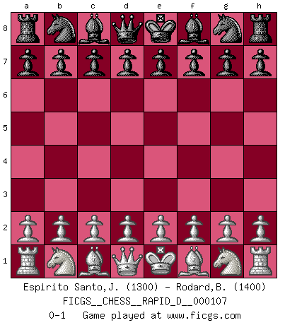 Last move : 0-1 2018 February 12 14:12:57 [Event "FICGS__CHESS__RAPID_D__000107"] [Site "FICGS"] [Date "2018.01.13"] [Round "1"] [White "Espirito Santo,Jean Carlo"] [Black "Rodard,Bert"] [Result "0-1"] [WhiteElo "1300"] [BlackElo "1400"] 0-1 This chess game has been lost on time (started : 2018.01.13 9:57:20) Player Black won this chess game. Follow this game move after move (download)Chess is a terrible game. If you have no center, your opponent has a freer position. If you do have a center, then you really have something to worry about ! (Siegbert Tarrasch) Die Jungen erwarten, dass Opa einfach umfällt. Dann aber kann Opa fünf Stunden lang Schach spielen und die jungen Gegner an die Wand drücken. (Viktor Kortschnoi) Los libros de Ajedrez deben de usarse igual como usamos los anteojos: para mejorar la vista, aunque algunos jugadores los quieren usar como si ellos les otorgaran la vision. (José Raúl Capablanca) Ce qui est bien, c'est d'avoir tout un tas de pièces en prise : l'adversaire ne peut en prendre qu'une à la fois. Cité par Thierry Audin. Mandala - that's it! 16x16 squares as multiple of the four and the eight because of the Four Noble Truths and the Noble Eightfold Path. (Heinz-Georg Lehnhoff about Big Chess)