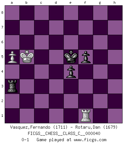 Last move : 0-1 2007 August 12 11:13:34 [Event "FICGS__CHESS__CLASS_C__000040"] [Site "FICGS"] [Date "2007.04.21"] [Round "1"] [White "Vasquez,Fernando"] [Black "Rotaru,Dan"] [Result "0-1"] [WhiteElo "1711"] [BlackElo "1679"] 1.e4 c5 2.d4 cxd4 3.c3 Nf6 4.e5 Nd5 5.Nf3 Nc6 6.cxd4 d6 7.Bc4 Nb6 8.Bb5 Bd7 9.Nc3 e6 10.O-O a6 11.Bd3 dxe5 12.dxe5 Nb4 13.Be4 Bc6 14.Qe2 Be7 15.Rd1 Qc7 16.a3 N4d5 17.Nxd5 Nxd5 18.Be3 Nxe3 19.Bxc6+ Qxc6 20.Qxe3 O-O 21.Rac1 Qb5 22.Rc7 Rad8 23.Rdc1 Rd7 24.h3 Rfd8 25.b4 h6 26.Rxd7 Rxd7 27.Kh2 Bd8 28.Rc8 Qd3 29.Qxd3 Rxd3 30.Rb8 b6 31.Ne1 Rd1 32.Kg3 Kh7 33.Nf3 g5 34.Kh2 a5 35.g3 Rd5 36.bxa5 bxa5 37.Kg2 Kg7 38.Rb7 Rc5 39.Rb8 Be7 40.Re8 Bf8 41.Ra8 Rd5 42.a4 Ba3 43.Kf1 Bb4 44.Ra7 Bc3 45.Ke2 Kg6 46.Ra8 Bxe5 47.Nxe5+ Rxe5+ 48.Kd3 h5 49.f3 Re1 50.Rxa5 Rh1 51.h4 gxh4 52.gxh4 Rxh4 53.Ra8 e5 54.a5 Rf4 55.Rg8+ Kf5 56.Rh8 Rxf3+ 57.Kc4 Kf4 58.Rxh5 f5 59.Rh1 Ra3 60.Kb5 e4 61.Rf1+ Ke5 0-1 Sicilian : Smith-Morra gambit Kingside Castling by player White (move 10) Kingside Castling by player Black (move 20) 10 pieces endgame at move 52 : White KRPPP , Black KRPPP WHITE : King + 1 Rook 3 Pawns BLACK : King + 1 Rook 3 Pawns 9 pieces endgame at move 52 : White KRPP , Black KRPPP WHITE : King + 1 Rook 2 Pawns BLACK : King + 1 Rook 3 Pawns 8 pieces endgame at move 56 : White KRP , Black KRPPP WHITE : King + 1 Rook 1 Pawn BLACK : King + 1 Rook 3 Pawns 7 pieces endgame at move 58 : White KRP , Black KRPP WHITE : King + 1 Rook 1 Pawn BLACK : King + 1 Rook 2 Pawns Player Black won this chess game. Follow this game move after move (download)Some sacrifices are sound; the rest are mine. (Mikhail Tal) Woher wissen wir, daß der Neanderthaler Blindschach gespielt hat? -- Bei Ausgrabungen wurden keine Schachbretter und Figuren gefunden. (Anonymous) Aquellos que dicen que entienden al Ajedrez, no entienden nada. (Robert Hubner) Nous vivons dans un monde échiquéen : chaque jour qui passe est un défi à relever. (Philosophe Sasha) God, you are such an idiot. - Actually, I thought I was more of a jerk. (Gregory House to Stacy Warner, House M.D.)