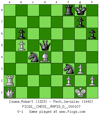 Last move : 0-1 2018 May 10 23:28:56 [Event "FICGS__CHESS__RAPID_D__000107"] [Site "FICGS"] [Date "2018.01.13"] [Round "1"] [White "Csoma,Robert"] [Black "Pech,Jaroslav"] [Result "0-1"] [WhiteElo "1323"] [BlackElo "1442"] 1.Nf3 d5 2.c4 d4 3.d3 c5 4.g3 Nc6 5.Bg2 e5 6.O-O Bd6 7.e3 Nge7 8.exd4 cxd4 9.Nbd2 Ng6 10.a3 a5 11.Ne4 Be7 12.Bd2 O-O 13.Rb1 f5 14.Neg5 h6 15.Nh3 Be6 16.b4 Qd7 17.b5 Nd8 18.Kh1 Bxa3 19.Ra1 Bc5 20.Re1 Nf7 21.Bxa5 e4 22.dxe4 b6 23.Bd2 Rxa1 24.Qxa1 fxe4 25.Rxe4 Bxh3 26.Nxd4 Bxg2+ 27.Kxg2 Nd6 28.Re2 Nxc4 29.Bc3 Qd5+ 30.Kg1 Nge5 31.Ra2 Bxd4 32.Bxd4 Nf3+ 0-1 Reti : Advance variation Kingside Castling by player White (move 6) Kingside Castling by player Black (move 12) Player Black won this chess game. Follow this game move after move (download)When you don't know what to do, wait for your opponent to get an idea - it's sure to be wrong. (Tarrasch) Es ist peinlich, dass ich nie Weltmeister wurde. Es wäre leicht, Leonid Breschnjew als Ursache vorzuschieben, dessen Apparat den Vorzeigekommunisten Anatoli Karpow in allem unterstützte. Aber Garri Kasparow zum Beispiel, der ebenfalls von den Sowjets unerwünscht war, hat trotz der Widerstände den WM-Titel erobert. (Viktor Kortschnoi) Fischer es el jugador mas fuerte del mundo. De hecho, el jugador mas fuerte que jamas haya existido. (Larry Evans) Un millionnaire : 'Monsieur Steinitz ! Vous ne participez aux tournois que pour l'argent, alors que moi je n'y viens que pour l'honneur.' Steinitz : 'Chacun joue pour ce qu'il n'a pas'... Fear is the path to the dark side. Fear leads to anger; anger leads to hate; hate leads to suffering. I sense much fear in you. (Master Yoda in Star Wars ep.1)