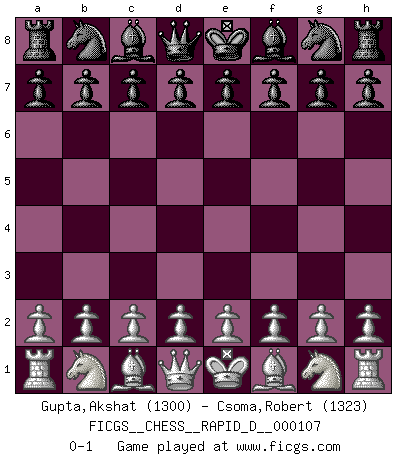 Last move : 0-1 2018 February 12 14:12:57 [Event "FICGS__CHESS__RAPID_D__000107"] [Site "FICGS"] [Date "2018.01.13"] [Round "1"] [White "Gupta,Akshat"] [Black "Csoma,Robert"] [Result "0-1"] [WhiteElo "1300"] [BlackElo "1323"] 0-1 This chess game has been lost on time (started : 2018.01.13 9:57:20) Player Black won this chess game. Follow this game move after move (download)My opponents make good moves too. Sometimes I don't take these things into consideration. (Bobby Fischer) Das Schachspiel übertrifft alle anderen Spiele so weit wie der Chimborasso einen Misthaufen. (Arthur Schopenhauer) Tu sabes que vas a perder. Aún cuando tenía la ventaja, yo sabía que iba a perder. - al estar jugando con Fischer (Andrew Soltis) Le jeu d'échecs fait naître et fortifie en nous plusieurs qualités précieuses dans le cours de l'existence, telles que la prévoyance, la circonspection, la prudence, et la persévérance. (Benjamin Franklin - 1783, la morale des échecs) Faith : not wanting to know what is true. (Friedrich Nietzsche)
