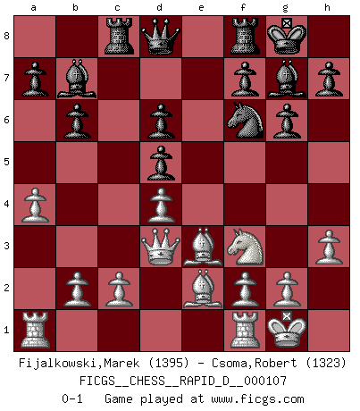Last move : 0-1 2018 March 6 4:35:31 [Event "FICGS__CHESS__RAPID_D__000107"] [Site "FICGS"] [Date "2018.01.13"] [Round "1"] [White "Fijalkowski,Marek"] [Black "Csoma,Robert"] [Result "0-1"] [WhiteElo "1395"] [BlackElo "1323"] 1.e4 d6 2.d4 Nf6 3.Nc3 g6 4.Nf3 Bg7 5.h3 O-O 6.Be3 c6 7.a4 b6 8.Be2 Bb7 9.O-O Nbd7 10.e5 Nd5 11.Nxd5 cxd5 12.exd6 exd6 13.Qd2 Nf6 14.Qd3 Rc8 0-1 This chess game has been lost on time (started : 2018.01.13 9:57:20) Pirc : Classical, h3 system Kingside Castling by player Black (move 5) Kingside Castling by player White (move 9) Player Black won this chess game. Follow this game move after move (download)Mistrust is the most necessary characteristic of the Chess player. (Siegbert Tarrasch) Wenn Dein Gegner dir ein Remis anbietet, versuch herauszufinden, weshalb er glaubt schlechter zu stehen. (Nigel Short) Los errores estan ahí, esperando a que se cometan. (Savielly Tartakower) Le jeu d'échecs est comme rejeté hors du temps. (Antoine de Saint-Exupéry) Happy endings are just stories that haven't finished yet. (Jane Smith in Mr & Mrs Smith)
