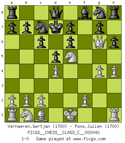 Last move : 1-0 2007 April 28 19:49:26 [Event "FICGS__CHESS__CLASS_C__000040"] [Site "FICGS"] [Date "2007.04.21"] [Round "1"] [White "Verhaeren,Gertjan"] [Black "Pons,Julien"] [Result "1-0"] [WhiteElo "1700"] [BlackElo "1700"] 1.e4 c6 2.d4 d5 3.e5 Bf5 4.h4 h6 5.g4 Bh7 6.e6 fxe6 7.Bd3 Bxd3 8.Qxd3 Na6 9.Qg6+ Kd7 10.Nf3 Nc7 11.Ne5+ 1-0 Caro-Kann : Advance variation Player White won this chess game. Follow this game move after move (download)Chess is a part of culture and if a culture is declining then Chess too will decline. (Mikhail Botvinnik) Ihnen, Herr Lasker, habe ich nur drei Worte zu sagen: Schach und matt. (Siegbert Tarrasch) Ser exitoso en el Ajedrez te permite descubrir tu propia personalidad. Eso es lo que deseo para los niños de mi clase. (Saudin Robovic) L'attaque fait le spectacle, la défense gagne les matchs. (Dicton footballistique) Big Chess is a place for big hallucinations. (Thibault de Vassal)
