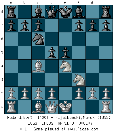 Last move : 0-1 2018 January 20 0:39:46 [Event "FICGS__CHESS__RAPID_D__000107"] [Site "FICGS"] [Date "2018.01.13"] [Round "1"] [White "Rodard,Bert"] [Black "Fijalkowski,Marek"] [Result "0-1"] [WhiteElo "1400"] [BlackElo "1395"] 1.e4 e5 2.Nf3 Nc6 3.Nc3 Nf6 4.Bc4 Nxe4 5.Nxe4 d5 0-1 Four knights : Italian variation Player Black won this chess game. Follow this game move after move (download)Botvinnik tried to take the mystery out of Chess, always relating it to situations in ordinary life. He used to call Chess a typical inexact problem similar to those which people are always having to solve in everyday life. (Garry Kasparov) Du weisst es gibt ein Problem mit Computern und Fernschach, wenn jeder eine Rating von 2450 hat. (John Christen Knudsen) La única cosa que los jugadores de Ajedrez tienen en común, es el Ajedrez. (Lodewijk Prins) La vie et les Echecs sont tous les deux une lutte constante. (Lasker) You must do what you feel is right... of course. (Obi-Wan Kenobi in Star Wars ep.4)