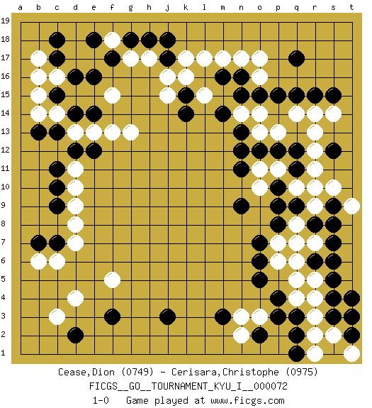 Last move : 1-0 2018 April 21 19:28:56 [Event "FICGS__GO__TOURNAMENT_KYU_I__000072"] [Site "FICGS"] [Date "2018.01.14"] [Round "1"] [Black "Cease,Dion"] [White "Cerisara,Christophe"] [Result "1-0"] [Rating 1 "0749"] [Rating 2 "0975"] 1.q17 q4 2.d16 d4 3.r15 c14 4.f17 d11 5.f3 c6 6.d2 c3 7.j3 l17 8.r6 o3 9.j17 o17 10.s4 r3 11.m3 r10 12.r8 r13 13.p15 b16 14.n16 n17 15.m16 m17 16.k15 k17 17.j18 o16 18.o15 l15 19.q12 r12 20.q11 r11 21.p9 r14 22.s15 s14 23.s9 q14 24.q15 p13 25.o12 o13 26.n13 n14 27.n12 o14 28.m14 k16 29.n15 j15 30.k14 j16 31.d14 d13 32.e14 f15 33.c15 b15 34.c13 b14 35.c17 g13 36.d12 e13 37.e12 f13 38.c11 d10 39.c10 d9 40.c9 d8 41.b7 b6 42.c7 d7 43.b13 c16 44.e16 b17 45.c18 f18 46.e18 h17 47.h18 g17 48.g18 f5 49.s3 s2 50.q2 r2 51.o2 n2 52.p3 n3 53.p4 q5 54.o5 p6 55.o6 p7 56.o7 q8 57.q9 r9 58.s8 r5 59.s5 r7 60.s7 q6 61.s6 s10 62.s12 t3 63.p8 q7 64.t4 t9 65.t2 p11 66.p12 q10 67.p10 o11 68.n11 o10 69.n9 t1 70.s1 r1 71.q3 r4 72.q1 t1 73.t3 1-0 Here are the names of the openings (joseki) played in the four corners : Corner d16 : d16 c14 Hoshi (Hwajeom, Seongjeom, Xingwei`) 4-4 Point. The star or hoshi (4-4) point, emphasizing influence at the potential expense of territory. Ikken Kakari (Hankan Keolch'im, Yi Gua`jiao~, 1-Space Low Approach). White 2 is the standard approach move to the 4-4. Corner d4 : d4 f3 Hoshi (Hwajeom, Seongjeom, Xingwei`) 4-4 Point. The star or hoshi (4-4) point, emphasizing influence at the potential expense of territory. Ikken Kakari (Hankan Keolch'im, Yi Gua`jiao~, 1-Space Low Approach). Black 2 is the standard approach move to the 4-4. Corner q4 : q4 r6 Hoshi (Hwajeom, Seongjeom, Xingwei`) 4-4 Point. The star or hoshi (4-4) point, emphasizing influence at the potential expense of territory. Ikken Kakari (Hankan Keolch'im, Yi Gua`jiao~, 1-Space Low Approach). Black 2 is the standard approach move to the 4-4. Player Black won this Go (weiqi, baduk) game. Follow this game move after move (download)Go is essentially a form of harmony. Go in the 21st century will have to be go of the 'harmony of the six points - the four quarters, the above and the below.' As in life we will need to view the whole rather than the part. Japanese go has focused too heavily on the local (joseki) rather than the whole for 300 years. The reason the Chinese and Koreans are overtaking the Japanese is that they are closer to achieve this whole-board view. (Go Seigen, 9p, 1994) I'll be back. (Arnold Schwarzenegger)