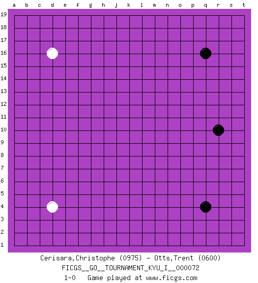 Last move : 1-0 2018 February 17 2:26:41 [Event "FICGS__GO__TOURNAMENT_KYU_I__000072"] [Site "FICGS"] [Date "2018.01.14"] [Round "1"] [Black "Cerisara,Christophe"] [White "Otts,Trent"] [Result "1-0"] [Rating 1 "0975"] [Rating 2 "0600"] 1.q16 d4 2.q4 d16 3.r10 1-0 This go game has been lost on time (started : 2018.01.14 17:51:23) Here are the names of the openings (joseki) played in the four corners : Corner q4 : q4 1-0 Hoshi (Hwajeom, Seongjeom, Xingwei`) 4-4 Point. The star or hoshi (4-4) point, emphasizing influence at the potential expense of territory. Player Black won this Go (weiqi, baduk) game. Follow this game move after move (download)One point in the center is worth ten in the corner. (Anonymous) Luck has a peculiar habit of favoring those who don't depend on it. (Author unknown)