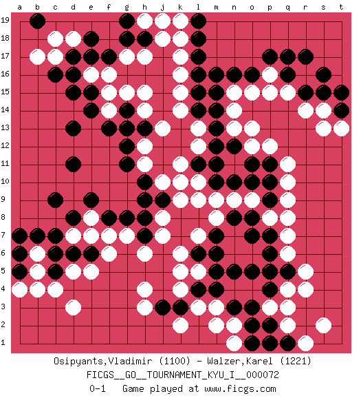 Last move : 0-1 2018 February 16 12:35:55 [Event "FICGS__GO__TOURNAMENT_KYU_I__000072"] [Site "FICGS"] [Date "2018.01.14"] [Round "1"] [Black "Osipyants,Vladimir"] [White "Walzer,Karel"] [Result "0-1"] [Rating 1 "1100"] [Rating 2 "1221"] 1.q17 d3 2.d16 q4 3.c5 d5 4.d6 e5 5.c7 c4 6.d11 h4 7.o3 m3 8.o5 q6 9.m4 l3 10.l4 k4 11.l6 q15 12.o16 p16 13.p17 o15 14.n16 r16 15.r17 n15 16.m16 q11 17.f17 e16 18.e17 f16 19.d15 c17 20.c16 d18 21.d17 b17 22.e18 c18 23.b19 f14 24.d13 k16 25.l15 g17 26.l17 k17 27.m15 k15 28.m13 o13 29.o7 p3 30.o2 k10 31.g8 j7 32.g12 p8 33.p10 q10 34.p9 q9 35.o8 o9 36.o10 n9 37.n10 m9 38.n12 l7 39.m6 k6 40.p6 q7 41.p4 q2 42.n3 m2 43.n5 j13 44.h10 f7 45.f8 e7 46.d8 e8 47.e9 g7 48.h8 j8 49.j9 k9 50.q5 r5 51.p5 r4 52.m7 m8 53.n8 b5 54.c6 b6 55.b7 j10 56.h9 l12 57.m10 l9 58.a6 a4 59.q16 p15 60.r15 r14 61.s15 s14 62.s16 l5 63.p2 q3 64.q1 r1 65.p1 s2 66.g18 h17 67.h18 j18 68.l18 l13 69.l14 k14 70.g14 g15 71.f13 h14 72.g13 o12 73.m12 h11 74.g11 h12 75.t14 t13 76.t15 s13 77.p11 p12 78.l11 k11 79.p7 q8 80.e14 f15 81.e15 d7 82.c9 k18 83.l19 n14 84.m14 l10 85.m11 n1 86.h13 h15 87.h7 h6 88.e6 f6 89.a7 n2 90.a5 b4 91.m5 k5 92.o1 h19 93.g19 j19 94.k3 k2 95.j3 h3 96.o11 n13 97.l16 k19 98.pass pass 99.pass pass 0-1 Here are the names of the openings (joseki) played in the four corners : Corner d4 : d3 c5 Komoku (Somok, Xiao~mu`) 3-4 Point. The komoku (3-4) point is the traditional corner enclosure move.. Ikken Kakari (Hankan Keolch'im, Yi Gua`jiao~, 1-Space Low Pincer). The small knight move is the basic approach move to the 3-4 point stone. It has been continually used for over four centuries. There are limitless variations, with new moves constantly being discovered. Black 2 opens the door to a treaure store of joseki. Corner q4 : q4 o3 Hoshi (Hwajeom, Seongjeom, Xingwei`) 4-4 Point. The star or hoshi (4-4) point, emphasizing influence at the potential expense of territory. Ikken Kakari (Hankan Keolch'im, Yi Gua`jiao~, 1-Space Low Approach). Black 2 is the standard approach move to the 4-4. Corner q16 : q17 q15 Komoku (Somok, Xiao~mu`) 3-4 Point. The komoku (3-4) point is the traditional corner enclosure move.. Ikken Takagakari (Hankan Nop'dakeolch'im, Yi Gaogua`jiao~, 1-Space High Approach). The 5-4 approach move has become more popular in modern times, as modern Go emphasizes speed and influence. Player White won this Go (weiqi, baduk) game. Follow this game move after move (download)The carpenter's square becomes ko. (Anonymous) A person who never made a mistake never tried anything new. (Albert Einstein)