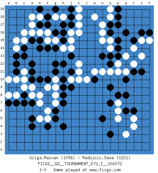 Last move : 1-0 2018 June 3 12:52:57 [Event "FICGS__GO__TOURNAMENT_KYU_I__000072"] [Site "FICGS"] [Date "2018.01.14"] [Round "1"] [Black "Gliga,Razvan"] [White "Radojcic,Sasa"] [Result "1-0"] [Rating 1 "1096"] [Rating 2 "1221"] 1.q16 c16 2.d4 r4 3.o3 q3 4.r6 r5 5.q6 p5 6.n5 p6 7.e17 d17 8.d15 c15 9.c14 b14 10.c13 c10 11.c8 d9 12.q8 k16 13.h16 n17 14.o17 n16 15.o16 o15 16.p15 o14 17.p14 e16 18.f17 f15 19.e14 e18 20.f18 d18 21.f14 g15 22.g16 h14 23.g12 d16 24.b13 b15 25.d11 c11 26.d12 o18 27.p17 j16 28.j17 k17 29.j18 k18 30.j19 k19 31.h15 j15 32.h17 f19 33.g19 g18 34.e19 h18 35.g14 j14 36.f10 e8 37.d7 f9 38.d10 c9 39.h4 l10 40.j11 k12 41.h9 g8 42.h8 g7 43.h7 g10 44.e10 h11 45.h12 j10 46.h10 g9 47.g11 k11 48.j9 d8 49.c7 e7 50.g6 f6 51.g5 e5 52.d5 f5 53.f4 b8 54.b7 a8 55.a7 a10 56.b11 b10 57.b12 q11 58.q10 p11 59.r11 r12 60.s11 q13 61.p13 o11 62.o9 k10 63.p18 o19 64.p19 m18 65.o7 p7 66.p8 r14 67.r15 s15 68.s16 t15 69.t16 s13 70.o12 n11 71.m10 m11 72.n13 p12 73.o13 n15 74.e15 f16 75.j13 1-0 This go game has been lost on time (started : 2018.01.14 17:51:23) Here are the names of the openings (joseki) played in the four corners : Corner q4 : r4 o3 Komoku (Somok, Xiao~mu`) 3-4 Point. The komoku (3-4) point is the traditional corner enclosure move.. Niken Kakari (Dukan Keolch'im, E`r Gua`jiao~, 2-Space Low Approach). Black 2 is used with friendly forces backing it up. Its purpose is to prevent a pincer. Locally it results in a loss, but may be appropriate fuseki strategy. It was popular in the late 1950s and early 1960s, but is not seen often nowadays, having been replaced by the one-space high approach, with which it has points in common. Corner d16 : c16 e17 Komoku (Somok, Xiao~mu`) 3-4 Point. The komoku (3-4) point is the traditional corner enclosure move.. Ikken Kakari (Hankan Keolch'im, Yi Gua`jiao~, 1-Space Low Pincer). The small knight move is the basic approach move to the 3-4 point stone. It has been continually used for over four centuries. There are limitless variations, with new moves constantly being discovered. Black 2 opens the door to a treaure store of joseki. Corner q16 : q16 n17 Hoshi (Hwajeom, Seongjeom, Xingwei`) 4-4 Point. The star or hoshi (4-4) point, emphasizing influence at the potential expense of territory. Niken Kakari (Dukan Keolch'im, E`r Gua`jiao~, 2-Space Low Approach). Black typically answers by 7-3 or 3-5 (which is not joseki). Player Black won this Go (weiqi, baduk) game. Follow this game move after move (download)There is death in the hane. (Anonymous) War is the child of passion, passion is the child of narcissism and narcissism is the child. (...) Another game ? (Thibault de Vassal)