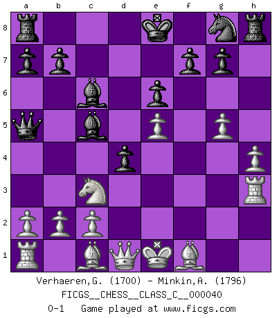 Last move : 0-1 2007 May 11 18:38:44 [Event "FICGS__CHESS__CLASS_C__000040"] [Site "FICGS"] [Date "2007.04.21"] [Round "1"] [White "Verhaeren,Gertjan"] [Black "Minkin,Alexander"] [Result "0-1"] [WhiteElo "1700"] [BlackElo "1796"] 1.e4 c6 2.d4 d5 3.e5 Bf5 4.h4 h6 5.g4 Bd7 6.Nc3 e6 7.Nge2 c5 8.f4 Be7 9.g5 hxg5 10.fxg5 Nc6 11.Bf4 Qb6 12.Na4 Qa5+ 13.Nac3 cxd4 14.Nxd4 Ba3 15.Nxc6 Bxc6 16.Bc1 d4 17.Rh3 Bc5 0-1 Caro-Kann : Advance variation Player Black won this chess game. Follow this game move after move (download)The King is a fighting piece. Use it ! (Wilhelm Steinitz) Der Knackpunkt bei der Konzentration ist, daß wir nur durch sie etwas Neues und Ungewöhnliches am Schachbrett finden können. Sie ist der einzige Weg durch neue neue Ideen eine Überraschung zu bereiten. (Garry Kasparov) Una compensación adecuada por un sacrificio es tener una combinación sólida que conduce a una posición ganadora; una compensación adecuada por una metida de pata es dejar a tu oponente arrebatar una derrota de las fauces de la victoria. (Bruce A. Moon) Dieu déplace le joueur, et celui-ci la pièce. Quel Dieu derrière Dieu commence donc la trame ? Arturo Perez-Reverte (prix de littérature policière 1993). I don't know, I don't care, and it doesn't make any difference. (Albert Einstein)