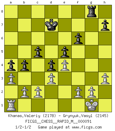 Last move : 1/2-1/2 2018 March 22 19:6:24 [Event "FICGS__CHESS__RAPID_M__000091"] [Site "FICGS"] [Date "2018.01.14"] [Round "1"] [White "Khanas,Valeriy"] [Black "Grynyuk,Vasyl"] [Result "1/2-1/2"] [WhiteElo "2178"] [BlackElo "2145"] 1.e4 e5 2.Nf3 Nc6 3.Bb5 a6 4.Ba4 Nf6 5.O-O Be7 6.Re1 b5 7.Bb3 O-O 8.h3 Bb7 9.d3 d6 10.a3 Nb8 11.Nbd2 Nbd7 12.Nf1 Re8 13.Ng3 c6 14.Nh2 a5 15.Qf3 a4 16.Ba2 Bc8 17.Bg5 Nc5 18.Ng4 Be6 19.Nxf6+ Bxf6 20.Bxf6 Qxf6 21.Qxf6 gxf6 22.Nh5 Nd7 23.Re3 Kf8 24.Rg3 Bxa2 25.Rxa2 d5 26.Ra1 Ke7 27.Ng7 Rh8 28.Re1 d4 29.Nf5+ Ke6 30.Ng7+ Ke7 31.Nf5+ Ke6 32.Nh6 b4 33.Rg7 c5 34.Rxf7 Rag8 35.Rxd7 Kxd7 36.Nxg8 Rxg8 37.Ra1 1/2-1/2 Ruy Lopez : Closed, 7...O-O Kingside Castling by player White (move 5) Kingside Castling by player Black (move 7) This chess game ended in a draw. Follow this game move after move (download)The game of Chess is not merely an idle amusement; several very valuable qualities of the mind are to be acquired and strengthened by it, so as to become habits ready on all occasions; for life is a kind of Chess. (Benjamin Franklin) Ich bin stolz ein Bulgare zu sein. (Veselin Topalov) Vive, pierde y aprende al observar a tu oponente como gana. (Amber Steenbock) L'ordinateur a tué l'originalité. Il n'y a plus guère d'aventures sur l'échiquier. (Jacob Murray) If everyone is thinking alike, then somebody isn't thinking. (US General George S. Patton)
