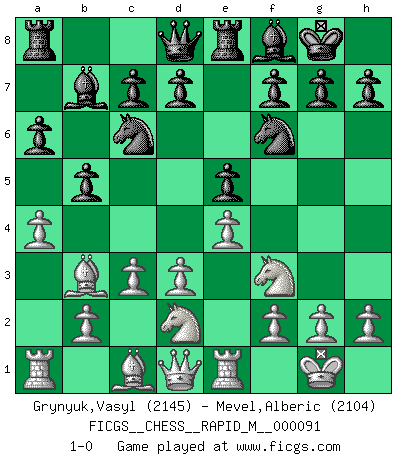 Last move : 1-0 2018 April 18 21:14:14 [Event "FICGS__CHESS__RAPID_M__000091"] [Site "FICGS"] [Date "2018.01.14"] [Round "1"] [White "Grynyuk,Vasyl"] [Black "Mevel,Alberic"] [Result "1-0"] [WhiteElo "2145"] [BlackElo "2104"] 1.e4 e5 2.Nf3 Nc6 3.Bb5 a6 4.Ba4 Nf6 5.O-O Be7 6.Re1 b5 7.Bb3 O-O 8.a4 Bb7 9.d3 Re8 10.Nbd2 Bf8 11.c3 1-0 This chess game has been lost on time (started : 2018.01.14 23:42:1) Ruy Lopez : Closed, 7...O-O Kingside Castling by player White (move 5) Kingside Castling by player Black (move 7) Player White won this chess game. Follow this game move after move (download)A big shock; the best chess player in history has passed away. (Lajos Portisch, about Bobby Fischer's death) Ja, ich habe einmal eine Blitzpartie gespielt, es war in einem Zug, 1929. --im Interview 1989 (Mikhail Moiseyevich Botvinik) Si el Ajedrez es una ciencia, es la mas inexacta. Si el Ajedrez es un arte, es demasiado inexacto para ser visto como tal. Si el Ajedrez es un deporte, es demasiado esotérico. Si el Ajedrez es un juego, es demasiado exigente para ser solo un juego. Si el Ajedrez es una aventura, es una muy demandante. Si el Ajedrez es una pasión, es una muy gratificante. Si el Ajedrez es la vida, es una muy triste. (Anónimo) On entre au jeu d'Echecs comme on entre en Religion. Pour le joueur d'Echecs, la partie d'Echecs c'est l'office, la messe, le défilé du 1er Mai, le dépôt de gerbe au Monument aux Morts. C'est un drame sacré. (Michel Roos) Optimism is a variety of information deficit. Sometimes especially true for correspondence chess games. (Michael Aigner)