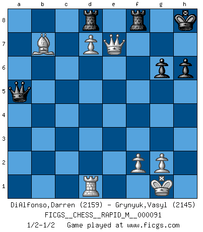 Last move : 1/2-1/2 2018 March 27 3:32:42 [Event "FICGS__CHESS__RAPID_M__000091"] [Site "FICGS"] [Date "2018.01.14"] [Round "1"] [White "DiAlfonso,Darren"] [Black "Grynyuk,Vasyl"] [Result "1/2-1/2"] [WhiteElo "2159"] [BlackElo "2145"] 1.d4 d5 2.c4 c6 3.Nf3 Nf6 4.Nc3 e6 5.Bg5 h6 6.Bxf6 Qxf6 7.e3 Nd7 8.Bd3 dxc4 9.Bxc4 g6 10.O-O Bg7 11.e4 e5 12.d5 Nb6 13.Nd2 O-O 14.Bb3 Qe7 15.Qe2 cxd5 16.Nxd5 Nxd5 17.exd5 Bf5 18.Nc4 e4 19.Rfd1 a5 20.d6 Qg5 21.Ne3 a4 22.Bd5 a3 23.Rab1 axb2 24.Rxb2 Bxb2 25.Qxb2 Rad8 26.Bxb7 Be6 27.h4 Qxh4 28.a4 Qg5 29.Qb4 f5 30.a5 f4 31.Qxe4 fxe3 32.Qxe6+ Kh7 33.Qxe3 Qxa5 34.Qe7+ Kh8 35.d7 1/2-1/2 QGD Slav : 4.Nc3 Kingside Castling by player White (move 10) Kingside Castling by player Black (move 13) This chess game ended in a draw. Follow this game move after move (download)By this measure (on the gap between Fischer & his contemporaries), I consider him the greatest world champion. (Garry Kasparov) Wer mein Gambit spielt, muß bereit sein, alle Brücken hinter sich abzubrechen. Es verändert den ganzen Menschen. Es wirkt wie ein Zauberstab und fördert verkümmerte, gute Charakter- eigenschaften wieder zu Tage. (Emil Joseph Diemer) Cualquier cambio de material en una posición debe venir por medio de un mate, una captura o promoción de Peón. (Purdy) En blitz, le Cavalier l'emporte sur le Fou. (Vlastimil Hort) . 'gn is not allowed in chess unless n is an integer between 1 and 8 inclusive, where 1 and 8 are to interpreted as the standard numerals standing for integers in the ordered real-closed field R, with the *canonical* ordering. (As opposed to, say, an integer in the domain Z[2+i*sqrt(5)] or an integer in some exotic Grothendieck topos). (Normajean Yates)