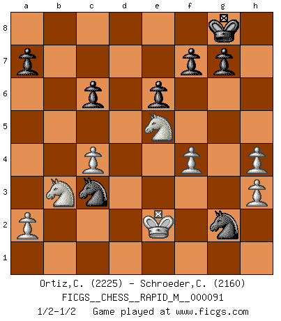 Last move : 1/2-1/2 2018 January 23 14:31:26 [Event "FICGS__CHESS__RAPID_M__000091"] [Site "FICGS"] [Date "2018.01.14"] [Round "1"] [White "Ortiz,Clodomiro"] [Black "Schroeder,Christoph"] [Result "1/2-1/2"] [WhiteElo "2225"] [BlackElo "2160"] 1.Nf3 d5 2.d4 e6 3.c4 Nf6 4.g3 dxc4 5.Bg2 c5 6.O-O Nc6 7.dxc5 Qxd1 8.Rxd1 Bxc5 9.Nbd2 c3 10.bxc3 O-O 11.Nb3 Be7 12.Nfd4 Bd7 13.Nb5 Ne5 14.Ba3 Bxa3 15.Nxa3 Bc6 16.f4 Neg4 17.Bxc6 bxc6 18.h3 Ne3 19.Rd3 Nf5 20.Rad1 h5 21.Nc5 h4 22.gxh4 Rab8 23.Nc4 Rb5 24.Nb3 Nh5 25.e3 Rd5 26.Kf2 Nf6 27.Ne5 Ne4+ 28.Ke1 Rfd8 29.c4 Rxd3 30.Rxd3 Rxd3 31.Nxd3 Nxe3 32.Ne5 Ng2+ 33.Ke2 Nc3+ 34.Kd2 Ne4+ 35.Ke2 Nc3+ 1/2-1/2 Reti Opening Kingside Castling by player White (move 6) Kingside Castling by player Black (move 10) This chess game ended in a draw. Follow this game move after move (download)Of Chess it has been said that life is not long enough for it, but that is the fault of life, not Chess. (William Ewart Napier) Offener Brief an US-Präsident Bush anlässlich der Verhaftung Bobby Fishers: Verhaften Sie mich. Stecken Sie mich in dieselbe Zelle wie Bobby Fisher und geben Sie uns ein Schachspiel mit. (Boris Vassilievich Spassky) El jugador de combinación piensa hacia adelante; comienza de la posición dada y trabaja las movidas contundentes en su mente. (Emanuel Lasker) Vous savez, camarade Pachman, je n'éprouve pas de plaisir à être ministre, je jouerais plutôt aux échecs comme vous, ou alors ferais une révolution au Venezuela. (Che Guevara à Ludek Pachman, 'Checkmate in Prague', 1975) I take risks, sometimes patients die, but not taking risks causes more patients to die. So I guess my biggest problem is I've been cursed with the ability to do the math. (Gregory House, House M.D.)