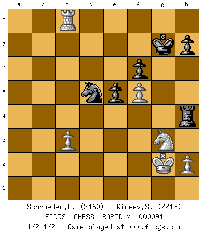 Last move : 1/2-1/2 2018 January 30 8:9:43 [Event "FICGS__CHESS__RAPID_M__000091"] [Site "FICGS"] [Date "2018.01.14"] [Round "1"] [White "Schroeder,Christoph"] [Black "Kireev,Sergey"] [Result "1/2-1/2"] [WhiteElo "2160"] [BlackElo "2213"] 1.e4 c5 2.Be2 Nc6 3.d3 e6 4.f4 d5 5.Nf3 Bd6 6.O-O Nge7 7.c3 f6 8.Be3 b6 9.Nbd2 O-O 10.g3 Bb7 11.a3 e5 12.f5 Qd7 13.g4 Nd8 14.g5 c4 15.gxf6 gxf6 16.Bh6 Rf7 17.Nh4 Bc5+ 18.Kh1 Kh8 19.Ng2 Bc6 20.Rb1 Rc8 21.dxc4 dxe4 22.Nb3 Bd6 23.c5 e3 24.Bf3 bxc5 25.Bxc6 Qxc6 26.Qf3 Qxf3 27.Rxf3 c4 28.Nc1 Ng8 29.Bxe3 Rb7 30.Ne2 Bxa3 31.Bc1 a5 32.Ng3 Nf7 33.Rf1 Rcb8 34.Ne3 Bxb2 35.Rxb2 Rxb2 36.Bxb2 Rxb2 37.Ra1 Rb5 38.Nxc4 Rc5 39.Ra4 Rc6 40.Kg2 Ne7 41.Rxa5 Rxc4 42.Ra7 Nd5 43.Rxf7 Rh4 44.Rf8+ Kg7 45.Rc8 1/2-1/2 Sicilian defense Kingside Castling by player White (move 6) Kingside Castling by player Black (move 9) This chess game ended in a draw. Follow this game move after move (download)He who takes the Queen's Knight's Pawn will sleep in the streets. (Anonymous) Wenn Du absolut nicht mehr weißt, was Du tun sollst, dann ist es Zeit für Panik. (John van der Wiel) El Ajedrez es tan interesante por sí solo, que no es necesario un interés monetario para persuadir a una persona a que lo practique; por lo tanto, nunca se juega por dinero. (Benjamin Franklin) Si le désir cupide (et stupide) de gagner est une inépuisable source de souffrance, une combinaison brillante sur l'échiquier est une découverte : le coquelicot qui s'épanouit lorsque apparaît la Voie Lactée. (Arrabal) Gambling is the son of avarice and the father of despair. (French proverb)