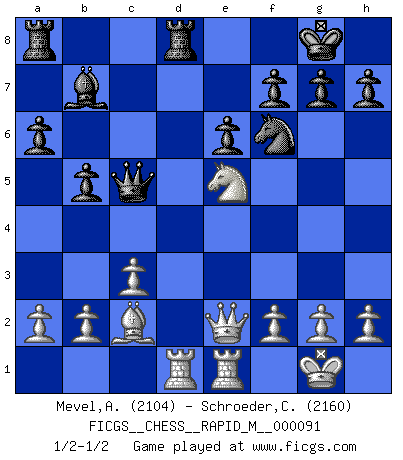 Last move : 1/2-1/2 2018 March 2 16:17:36 [Event "FICGS__CHESS__RAPID_M__000091"] [Site "FICGS"] [Date "2018.01.14"] [Round "1"] [White "Mevel,Alberic"] [Black "Schroeder,Christoph"] [Result "1/2-1/2"] [WhiteElo "2104"] [BlackElo "2160"] 1.e4 e6 2.d4 d5 3.Nc3 dxe4 4.Nxe4 Nd7 5.Nf3 Ngf6 6.Bd3 c5 7.Nxf6+ Nxf6 8.Be3 Qc7 9.Qe2 a6 10.O-O b6 11.c3 Bb7 12.Rfe1 b5 13.Bc2 Be7 14.Rad1 O-O 15.dxc5 Bxc5 16.Bxc5 Qxc5 17.Ne5 Rfd8 1/2-1/2 French : Rubinstein variation Kingside Castling by player White (move 10) Kingside Castling by player Black (move 14) This chess game ended in a draw. Follow this game move after move (download)Chess is life. (Bobby Fischer) Glücklicherweise sind Großmeister Ruben Fines reine Schachbücher weniger phallozentrisch [als seine Schachpsychologie] und deswegen auch weniger lächerlich. (Nigel Short) Si yo gano un torneo, yo lo gano por mí mismo. Yo hago las jugadas. Nadie me ayuda. (Bobby Fischer) Karpov est une pièce de musée. (Garry Kasparov) This is where the fun begins. (Anakin Skywalker in Star Wars ep.3)